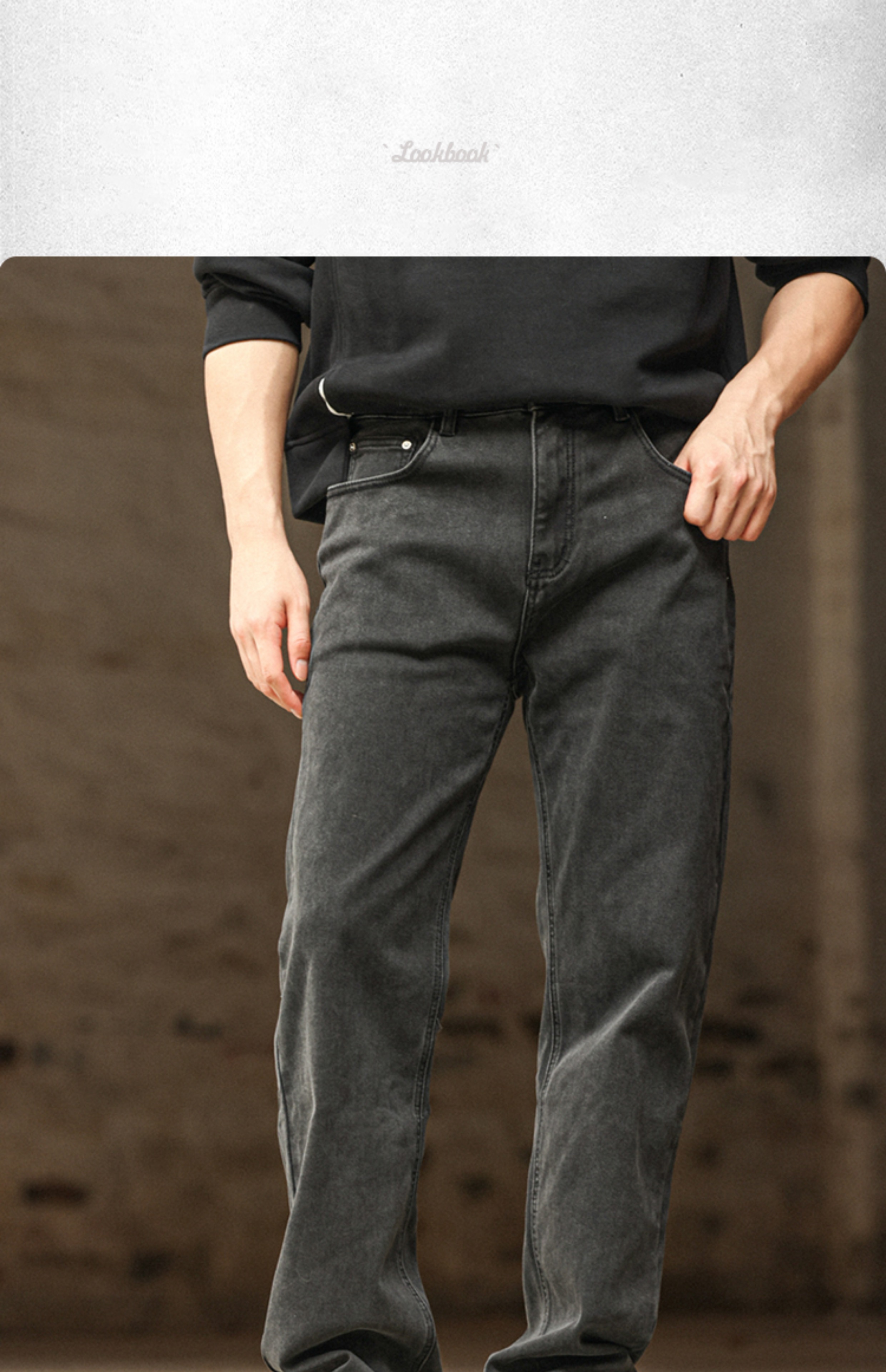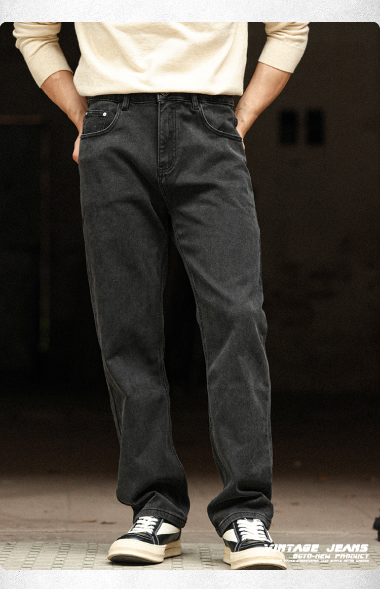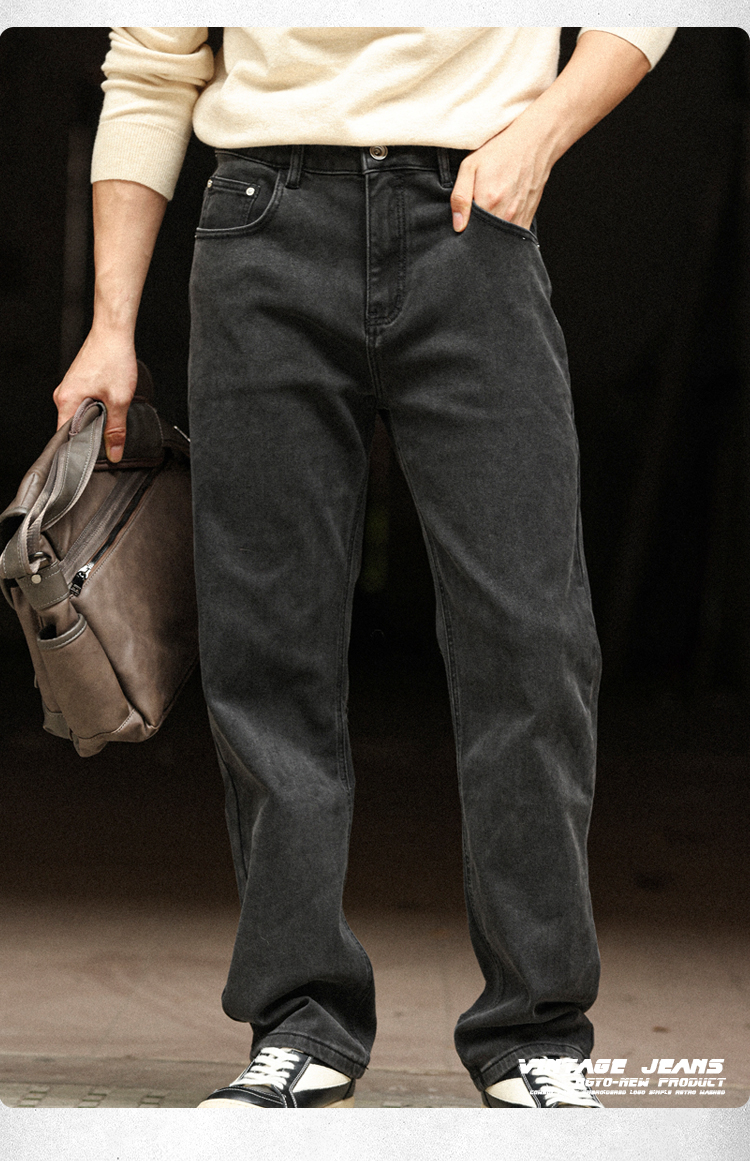 美式復古黑色牛仔褲男洗水做舊中腰窄版闊腿直筒長褲子