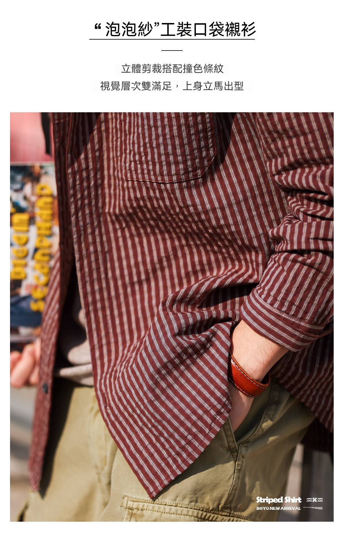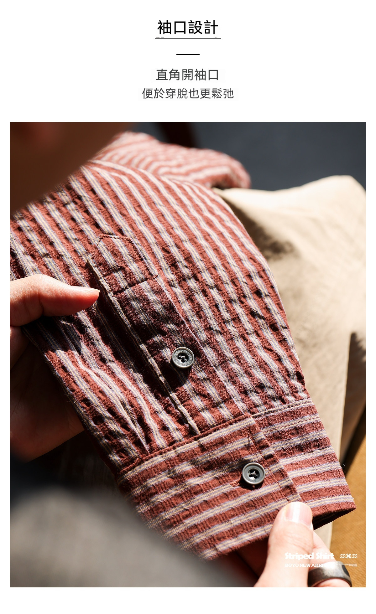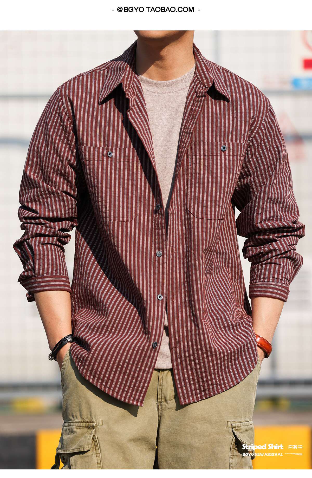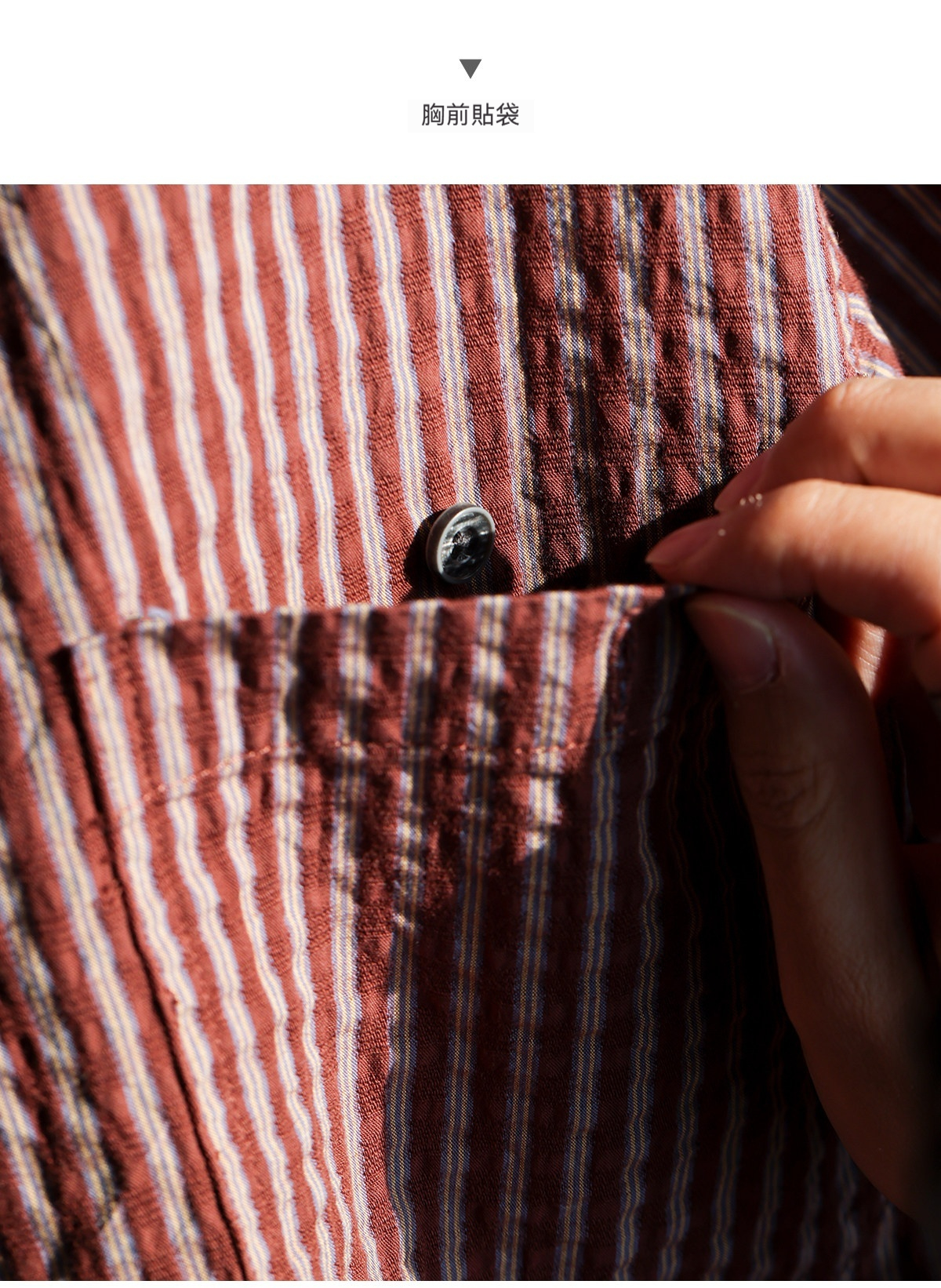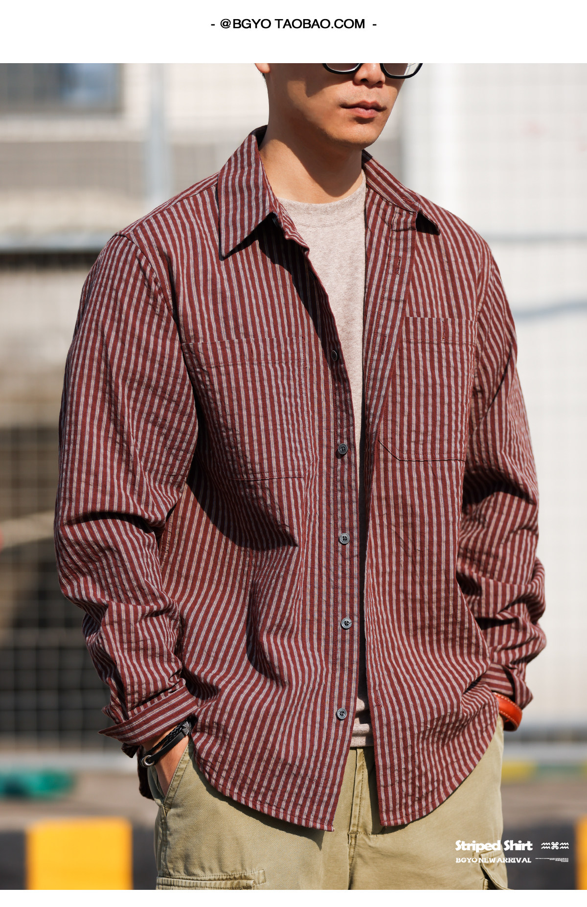 美式復古120g純棉豎條紋襯衫男寬鬆泡泡紗咖色襯衣外套