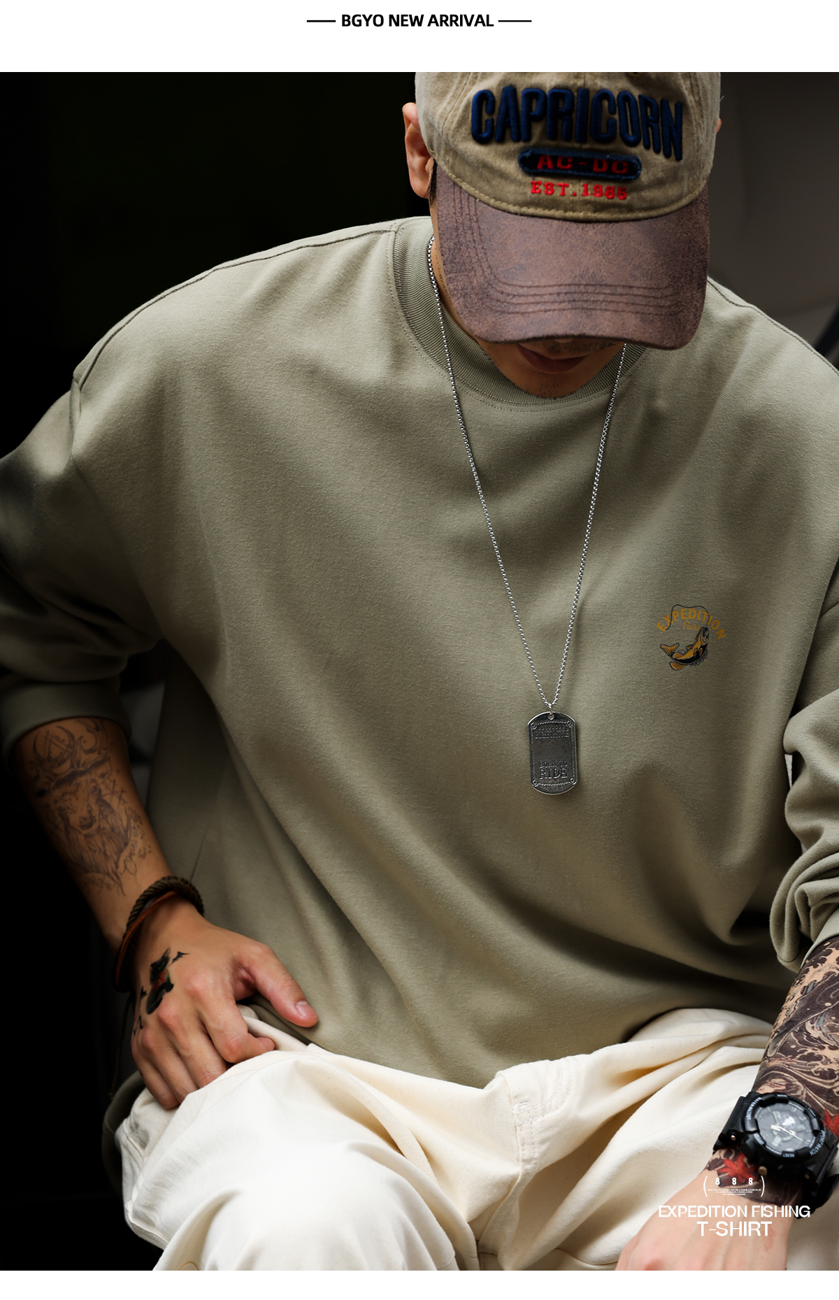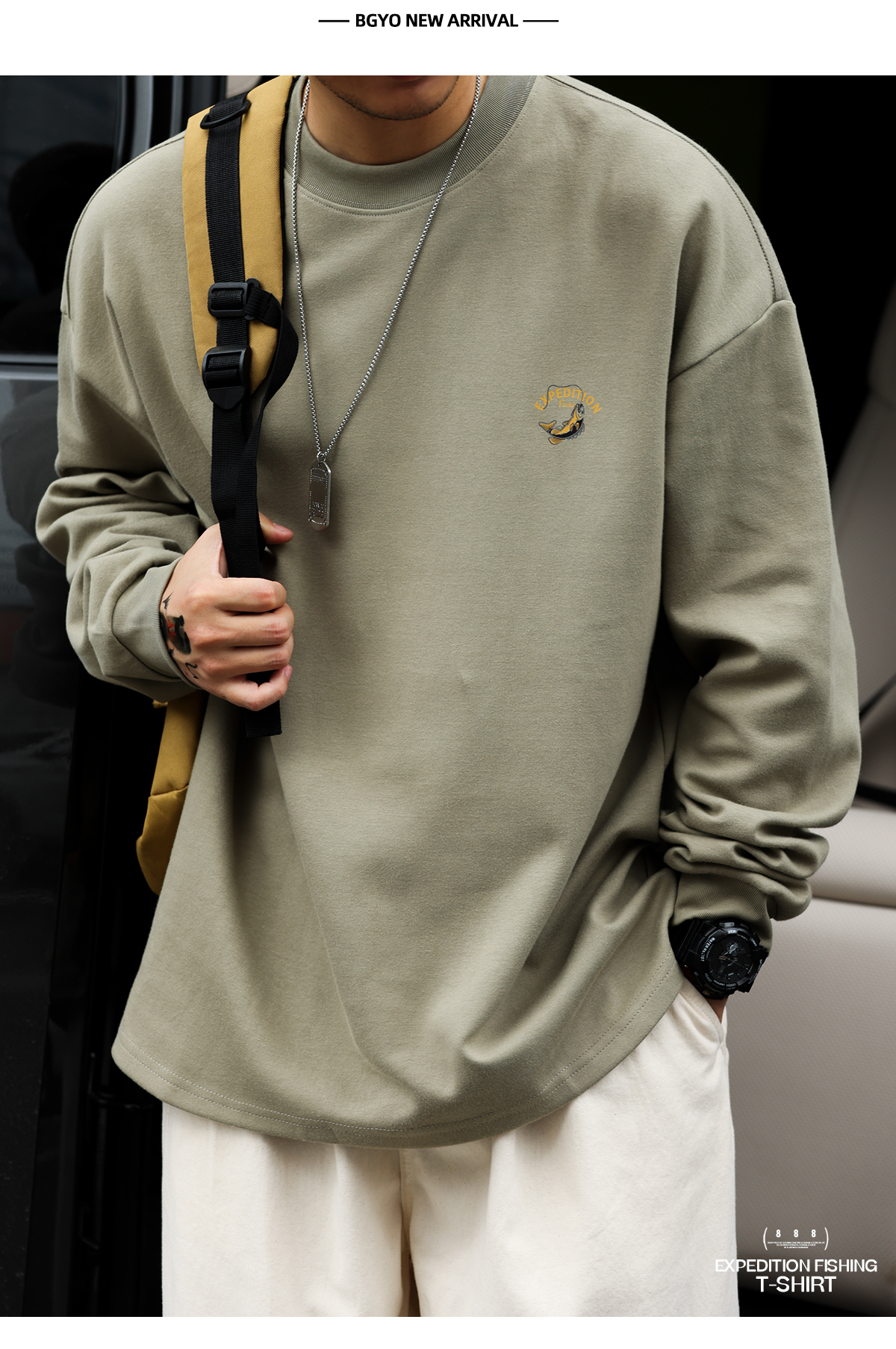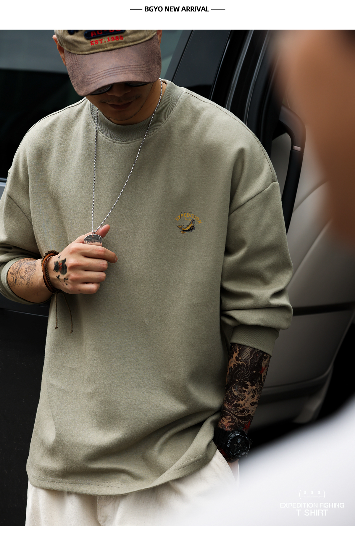 美式復古300g重磅長袖T恤男小領口釣魚印花灰綠色打底衫