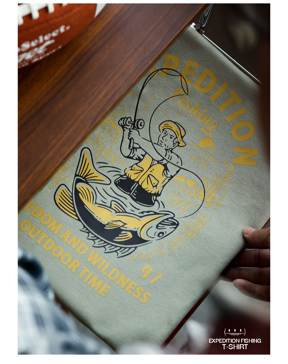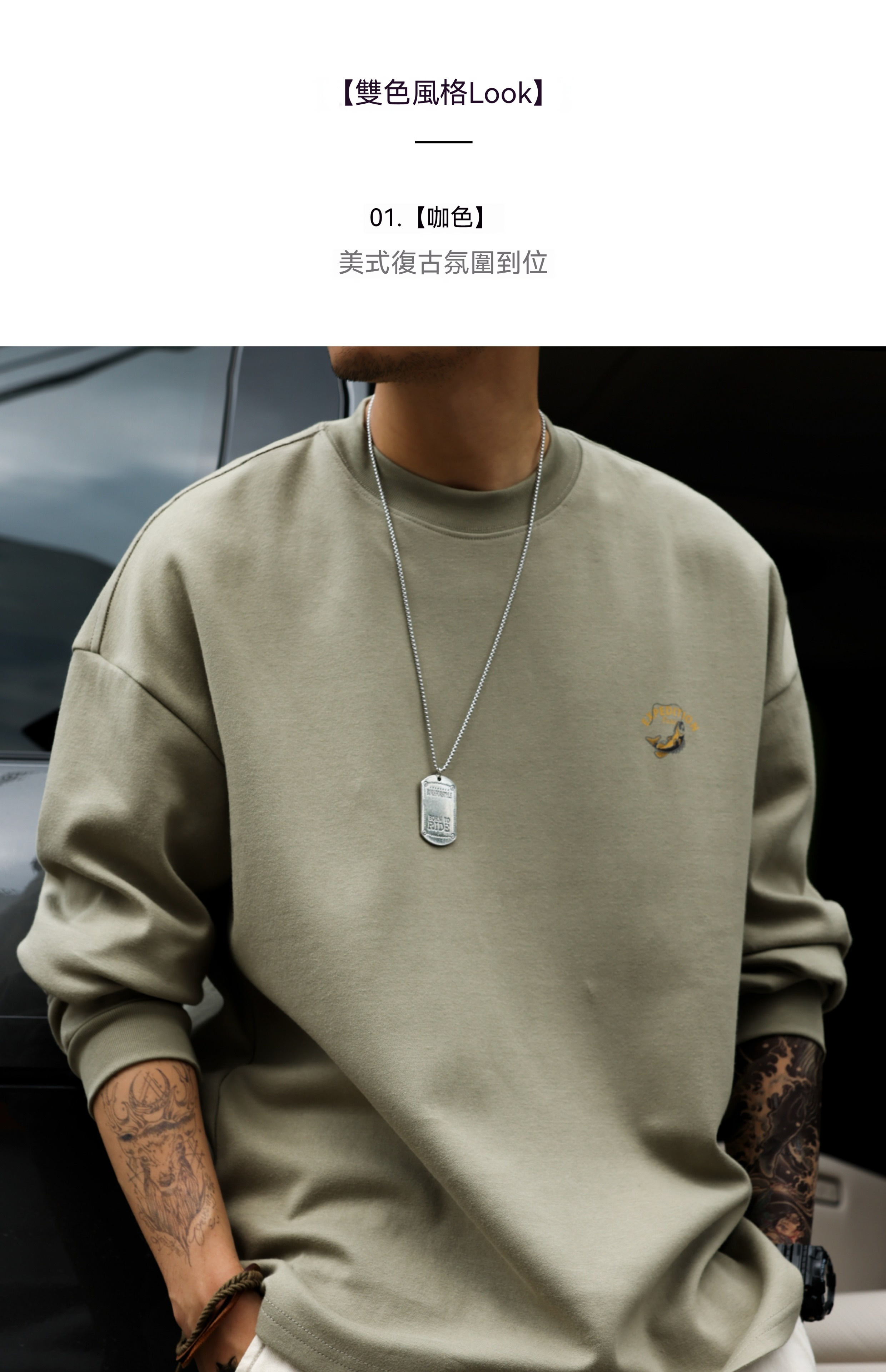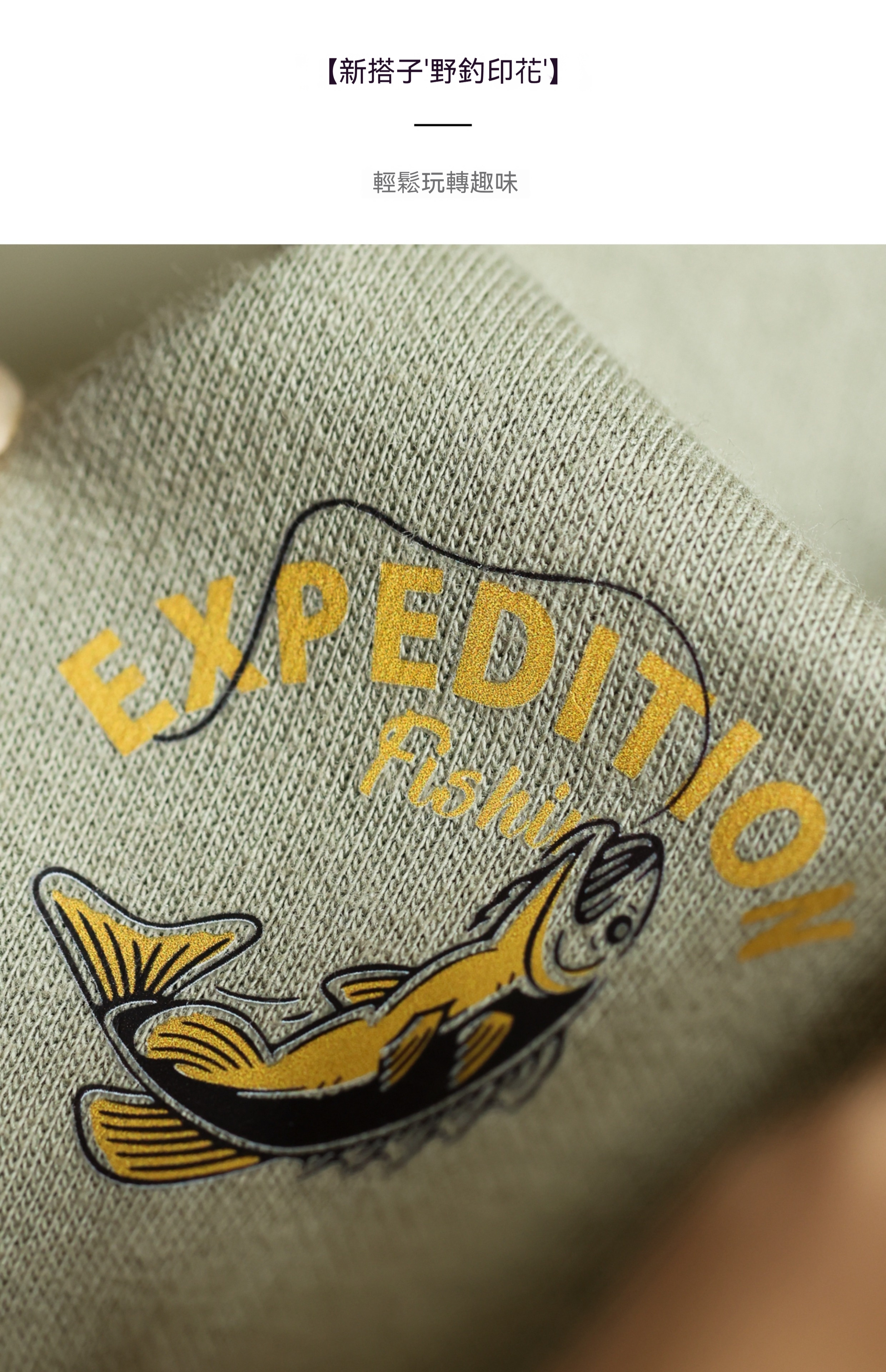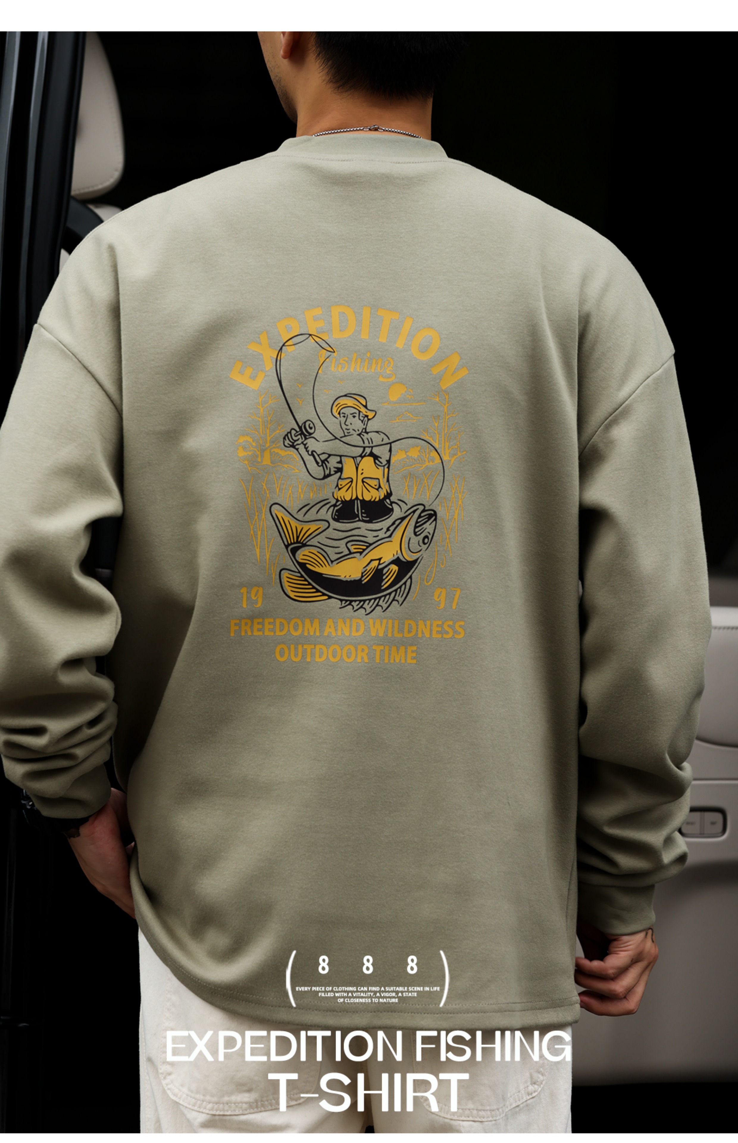 美式復古300g重磅長袖T恤男小領口釣魚印花灰綠色打底衫