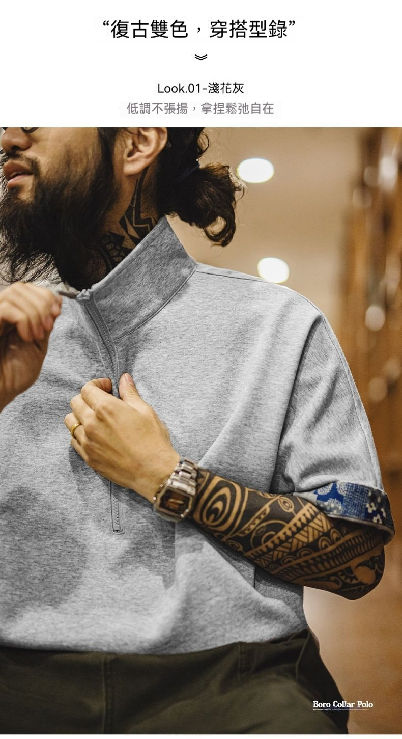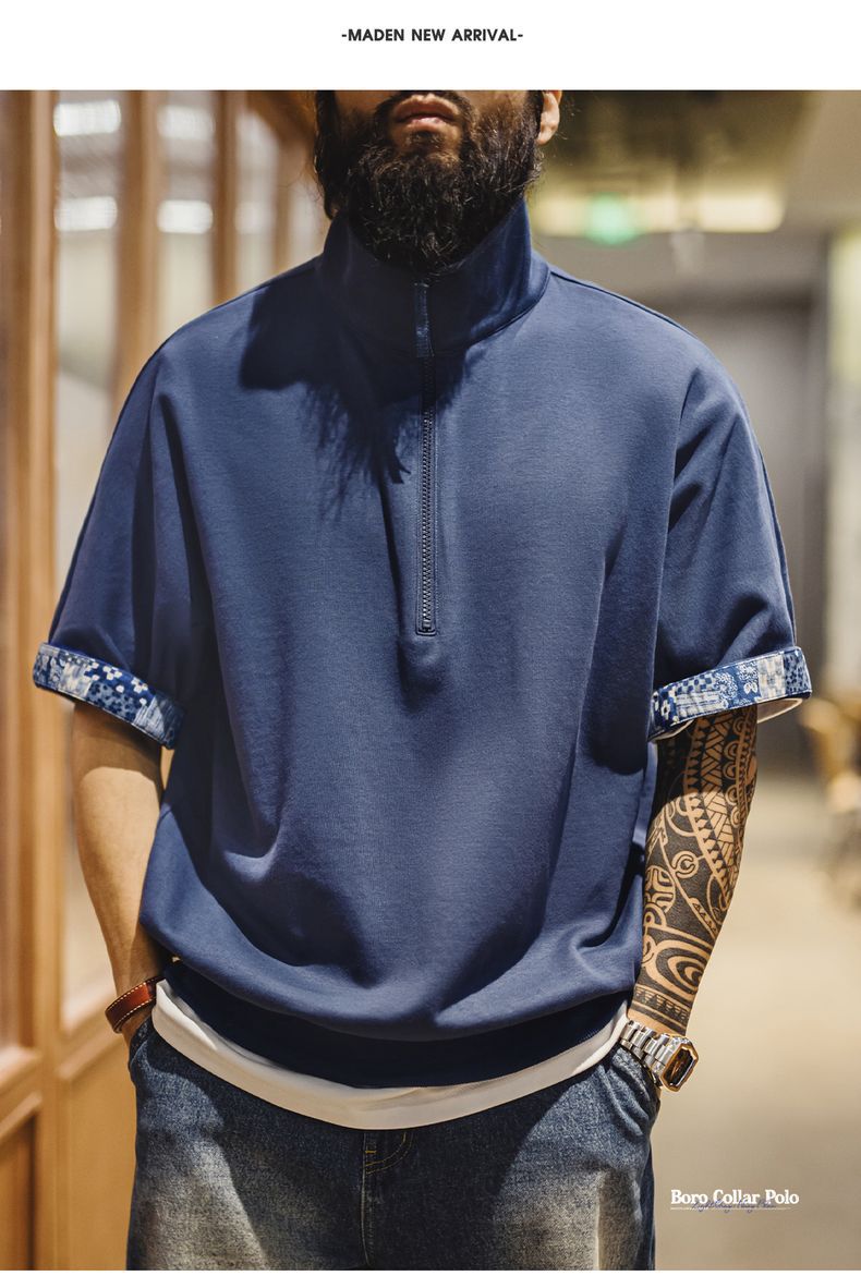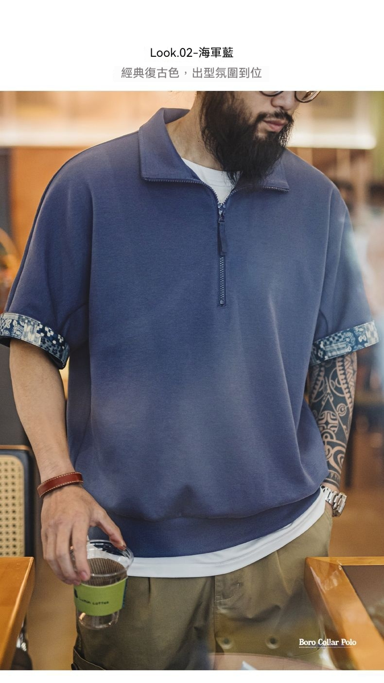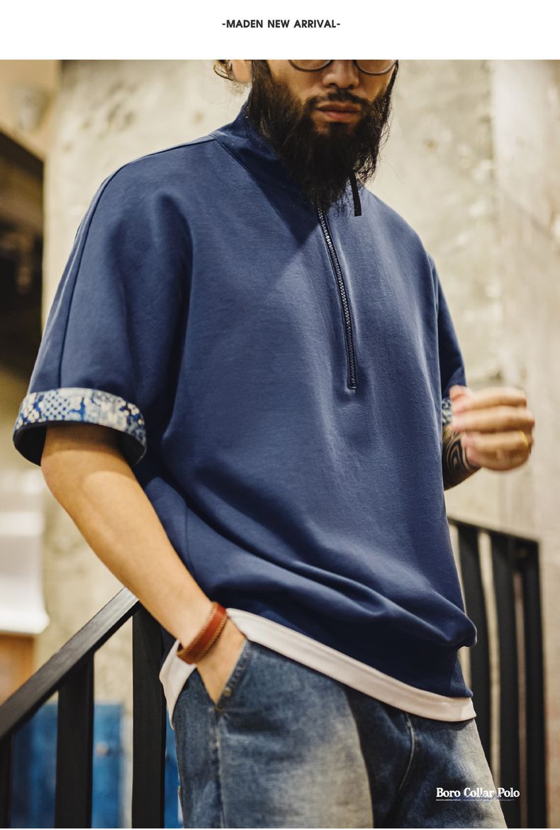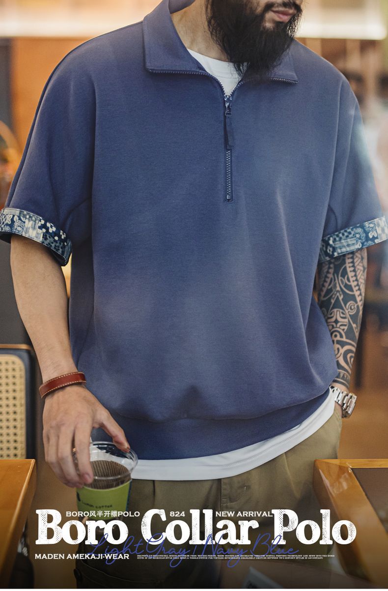 美式復古boro風半開襟polo古布印花寬鬆休閒翻領T恤男夏