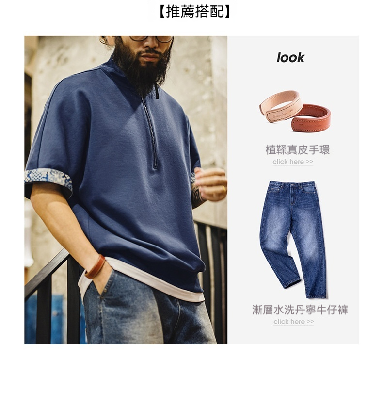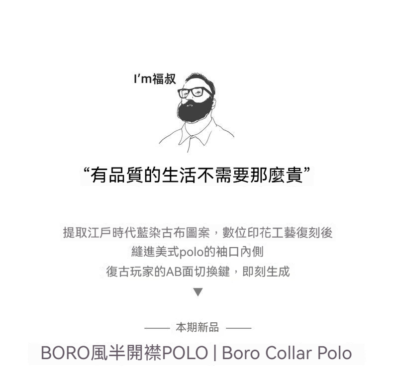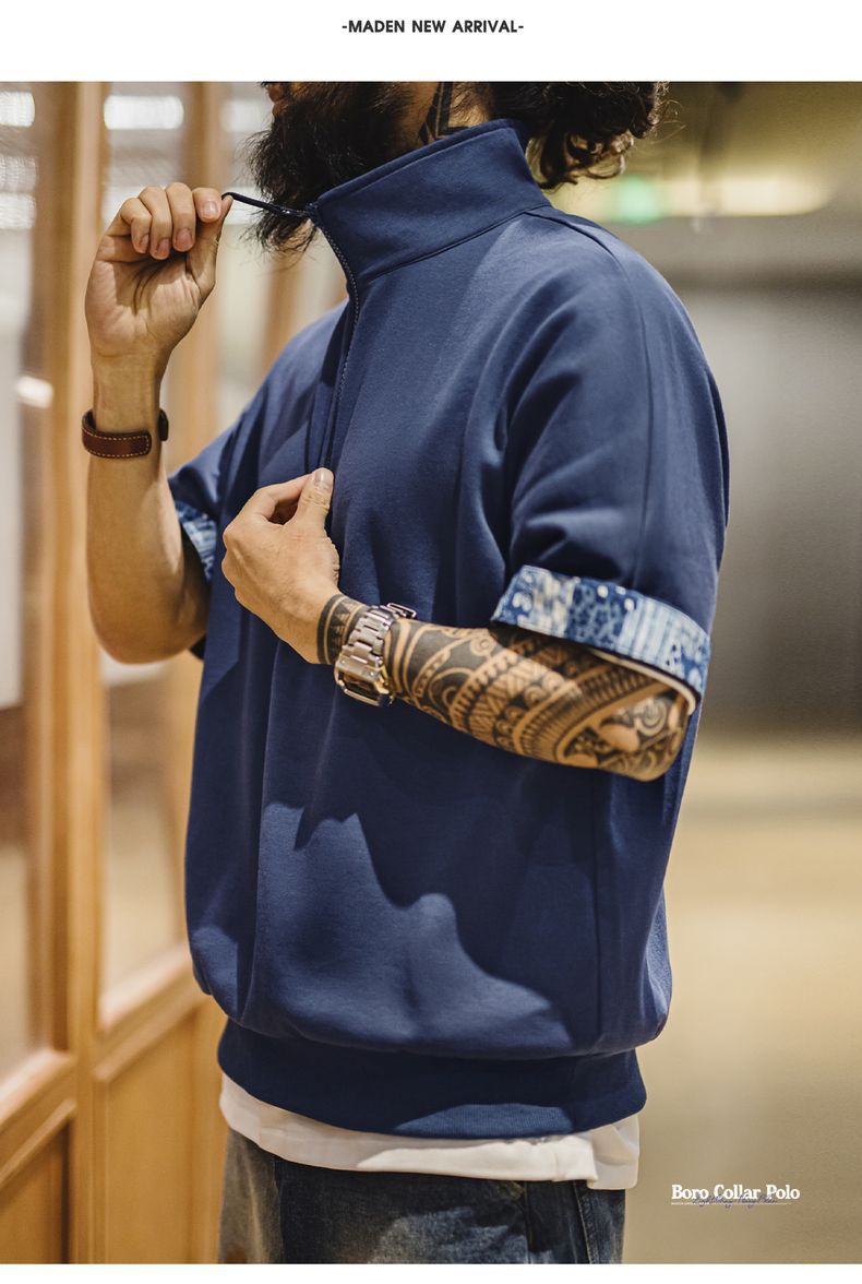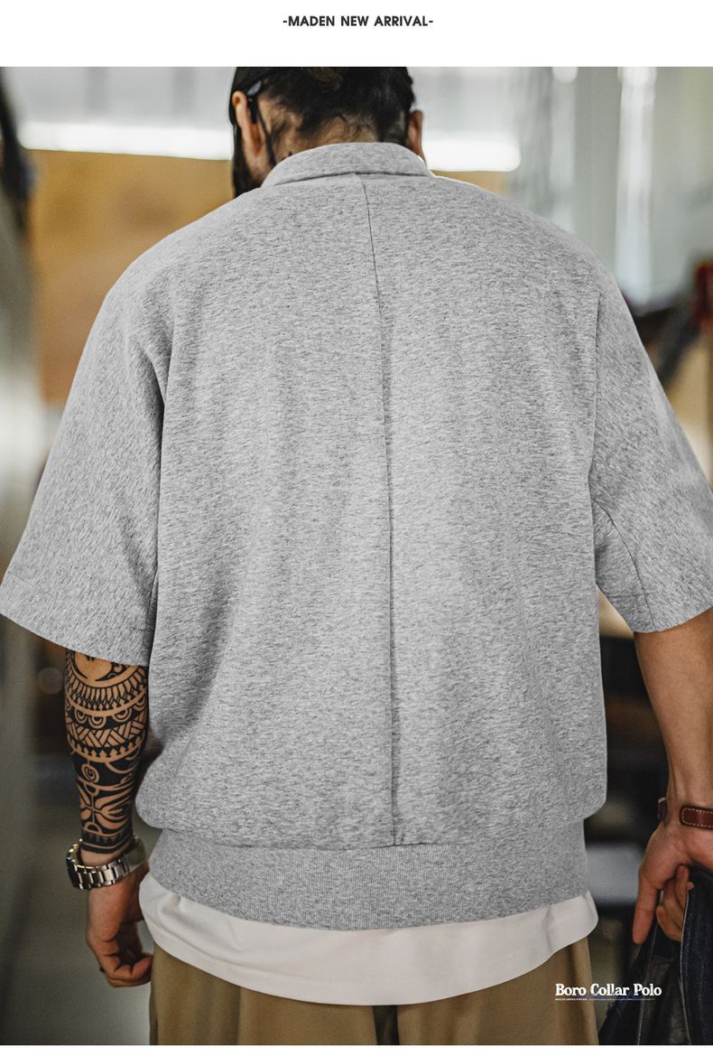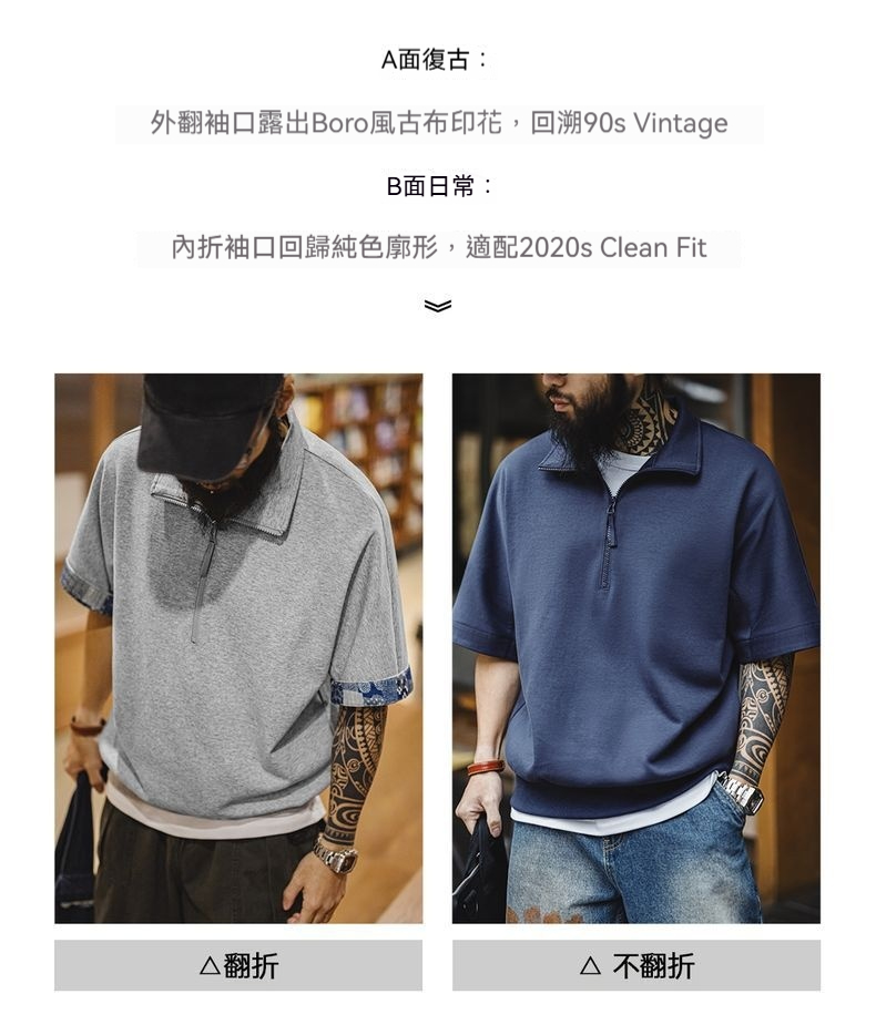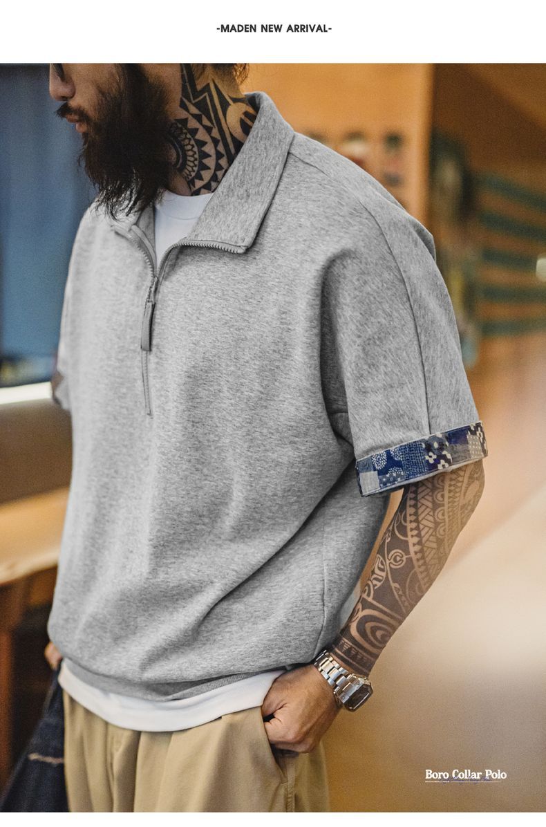 美式復古boro風半開襟polo古布印花寬鬆休閒翻領T恤男夏