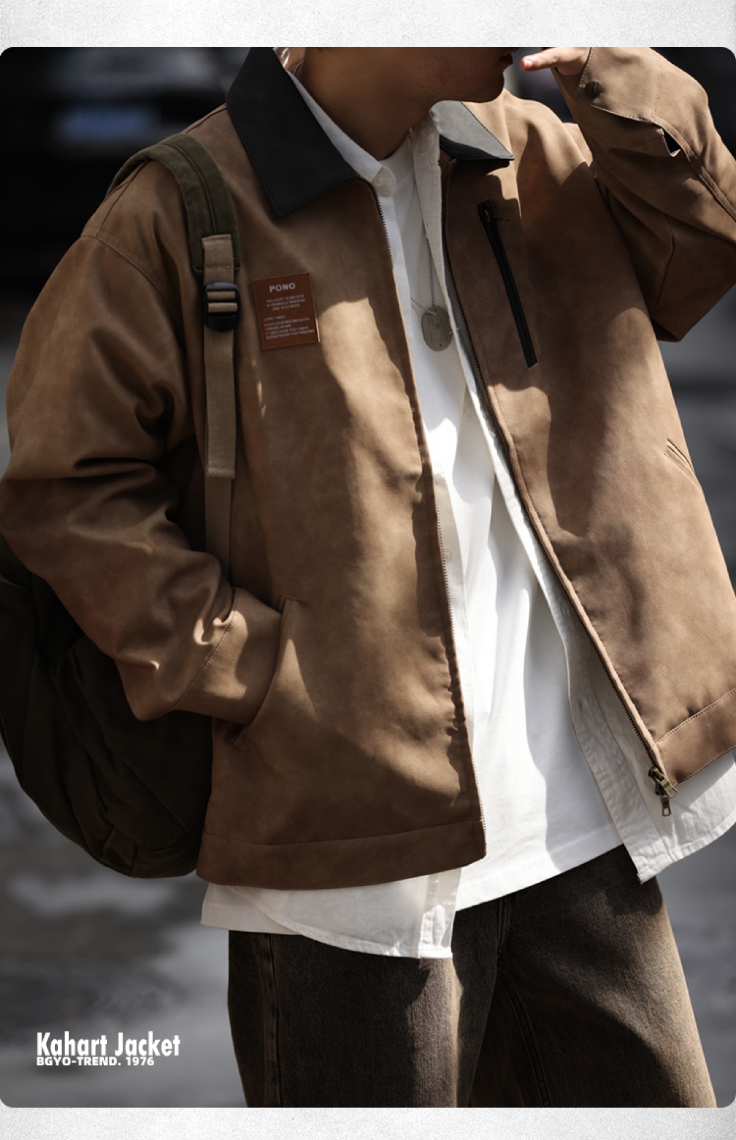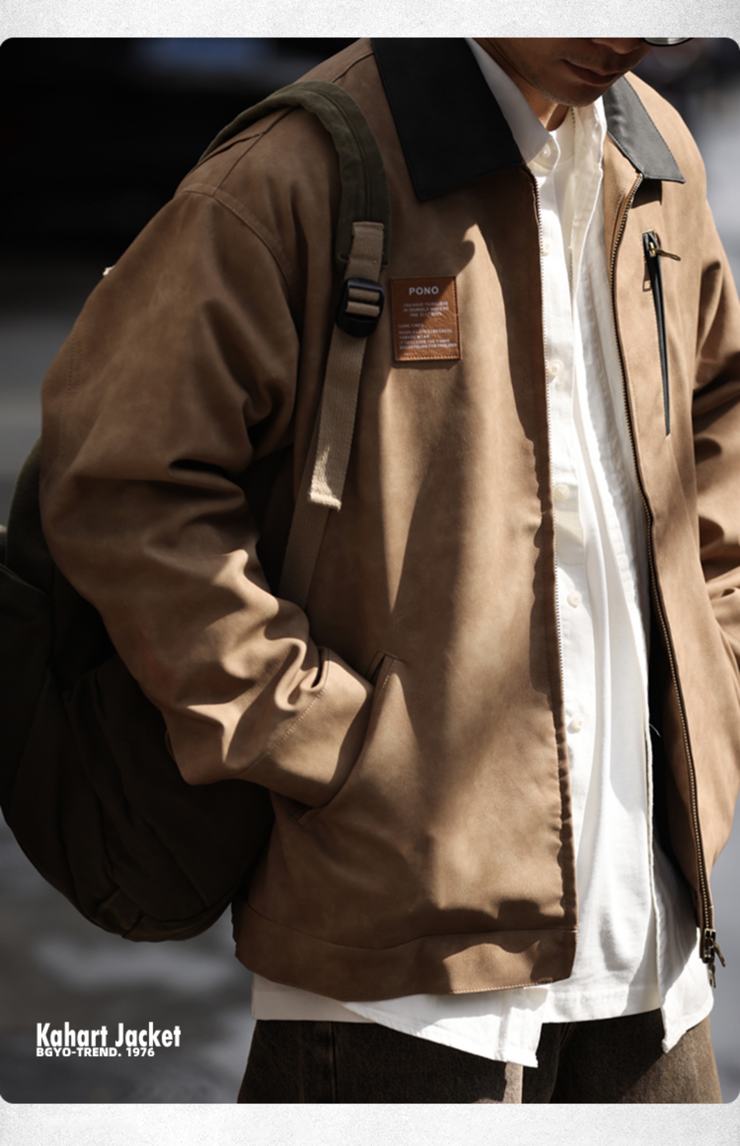 美式復古PU皮卡哈特夾克男質感痞帥廊型撞色翻領機車外套