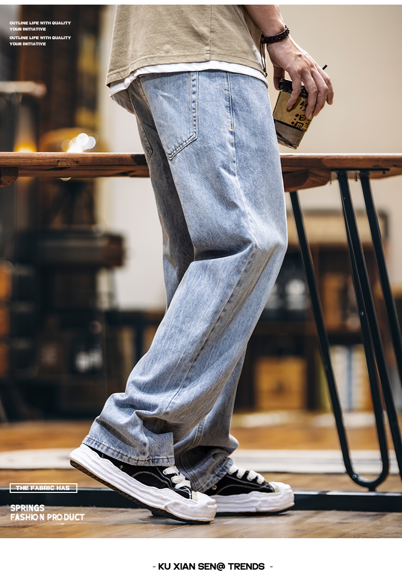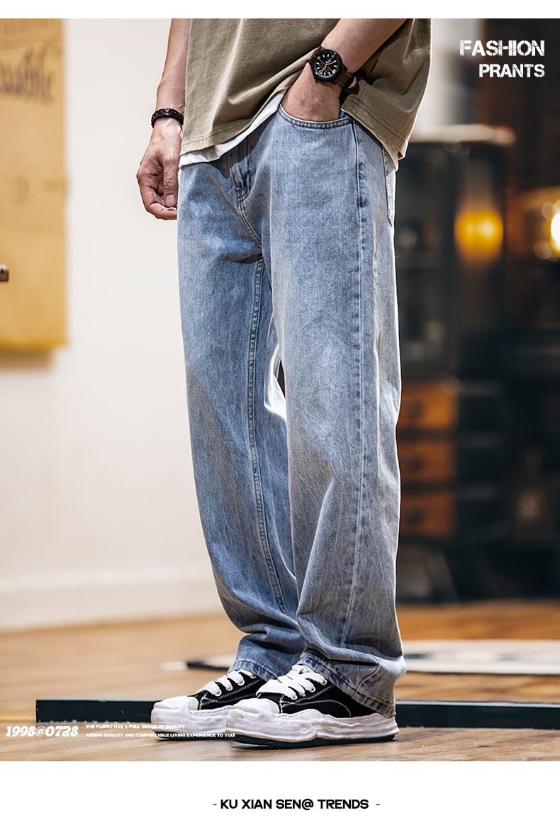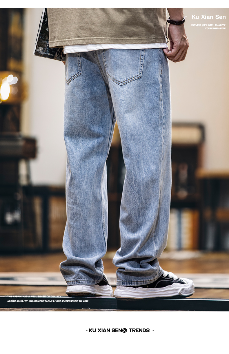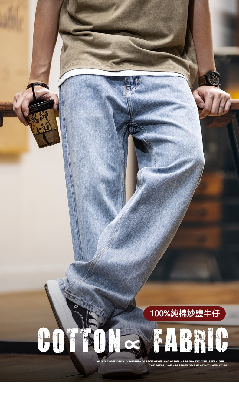 美式淺藍色復古牛仔褲男士春夏2025新款純棉水洗寬鬆直筒褲子男