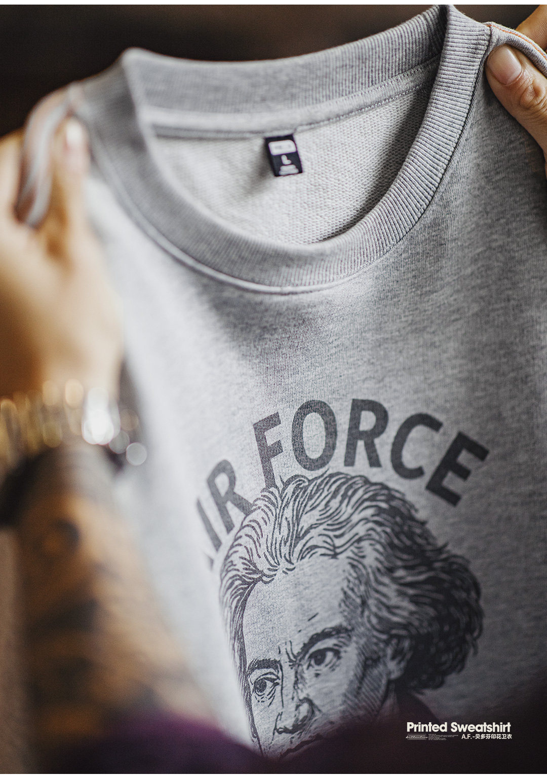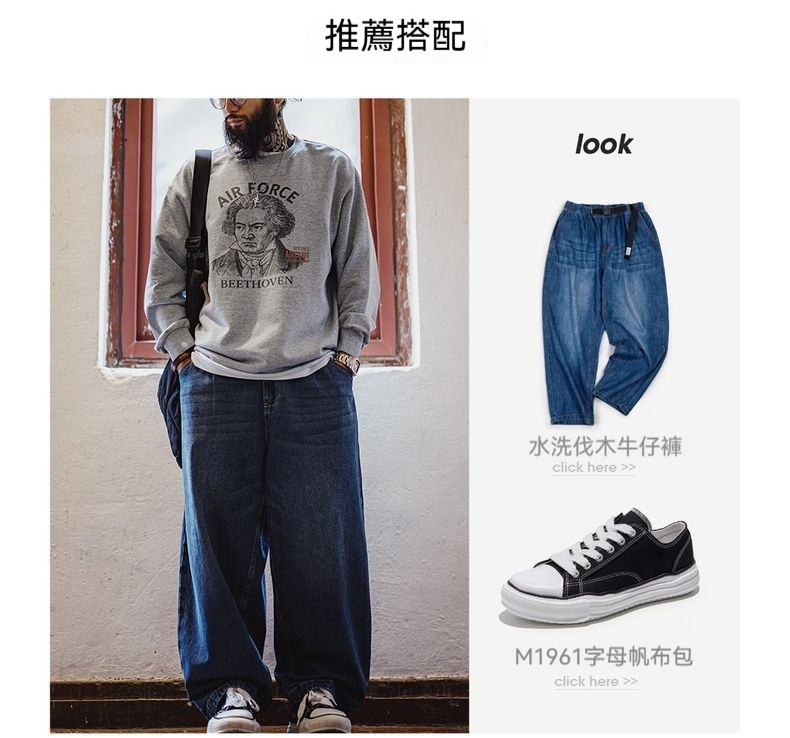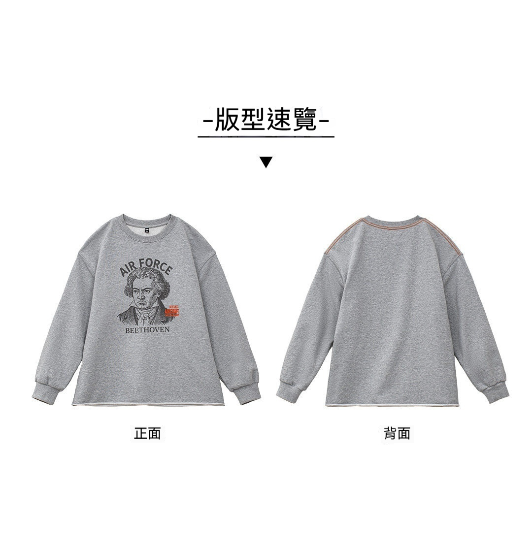 美式灰色卷邊全純棉衛衣寬鬆套頭印花刺繡長袖T恤男款春