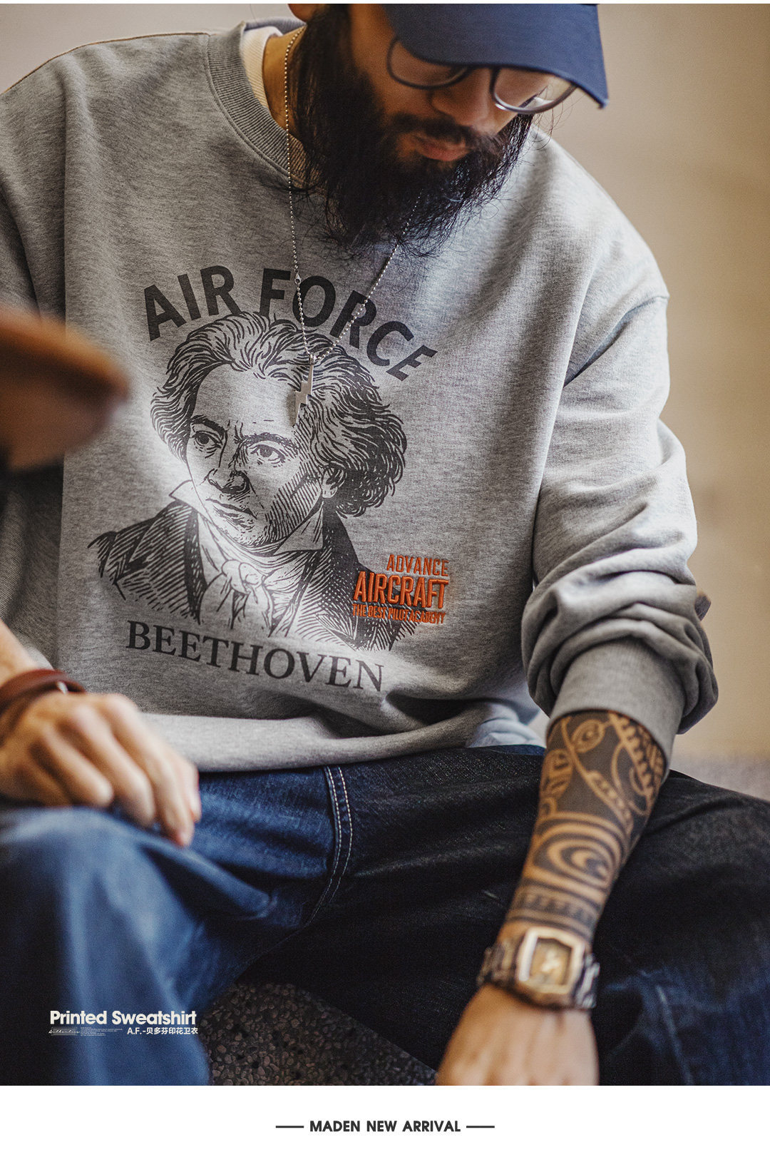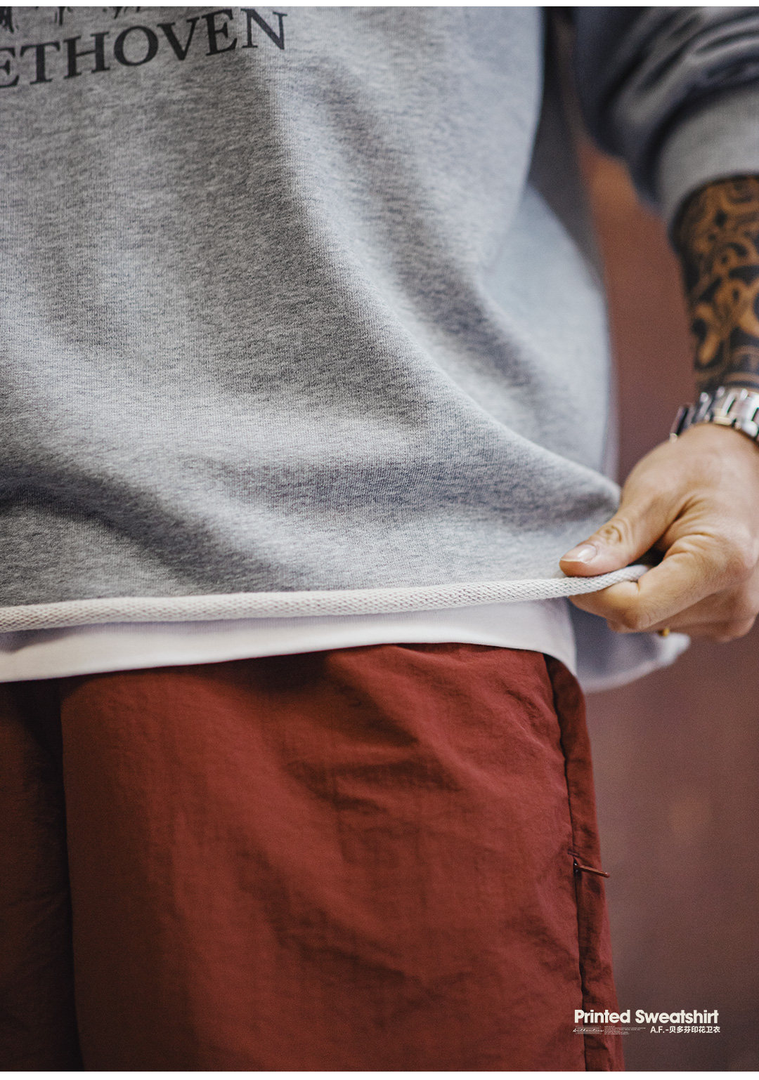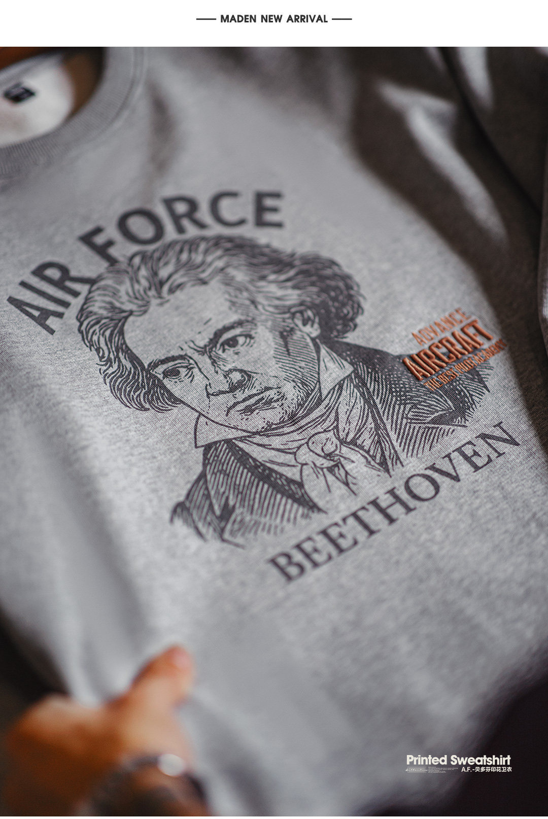 美式灰色卷邊全純棉衛衣寬鬆套頭印花刺繡長袖T恤男款春