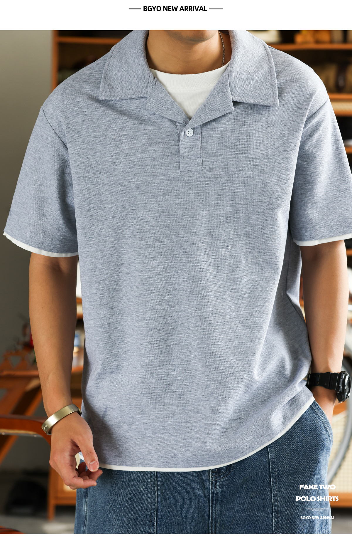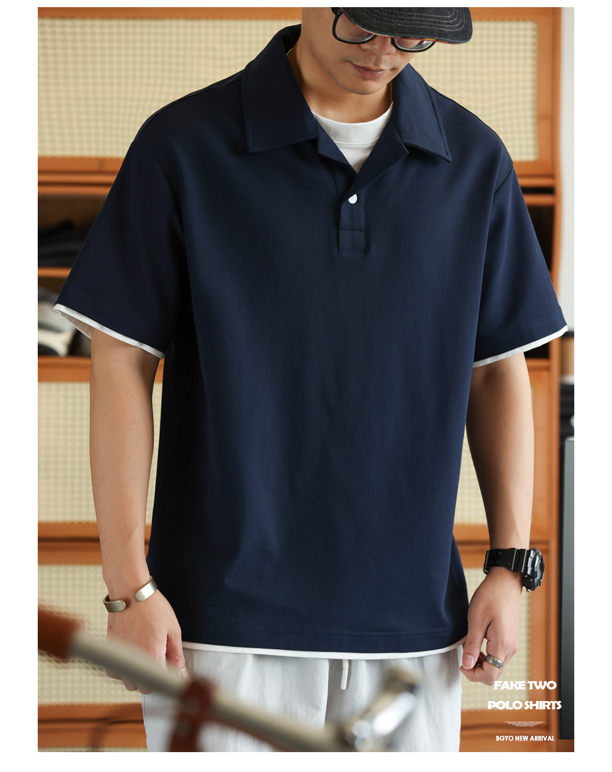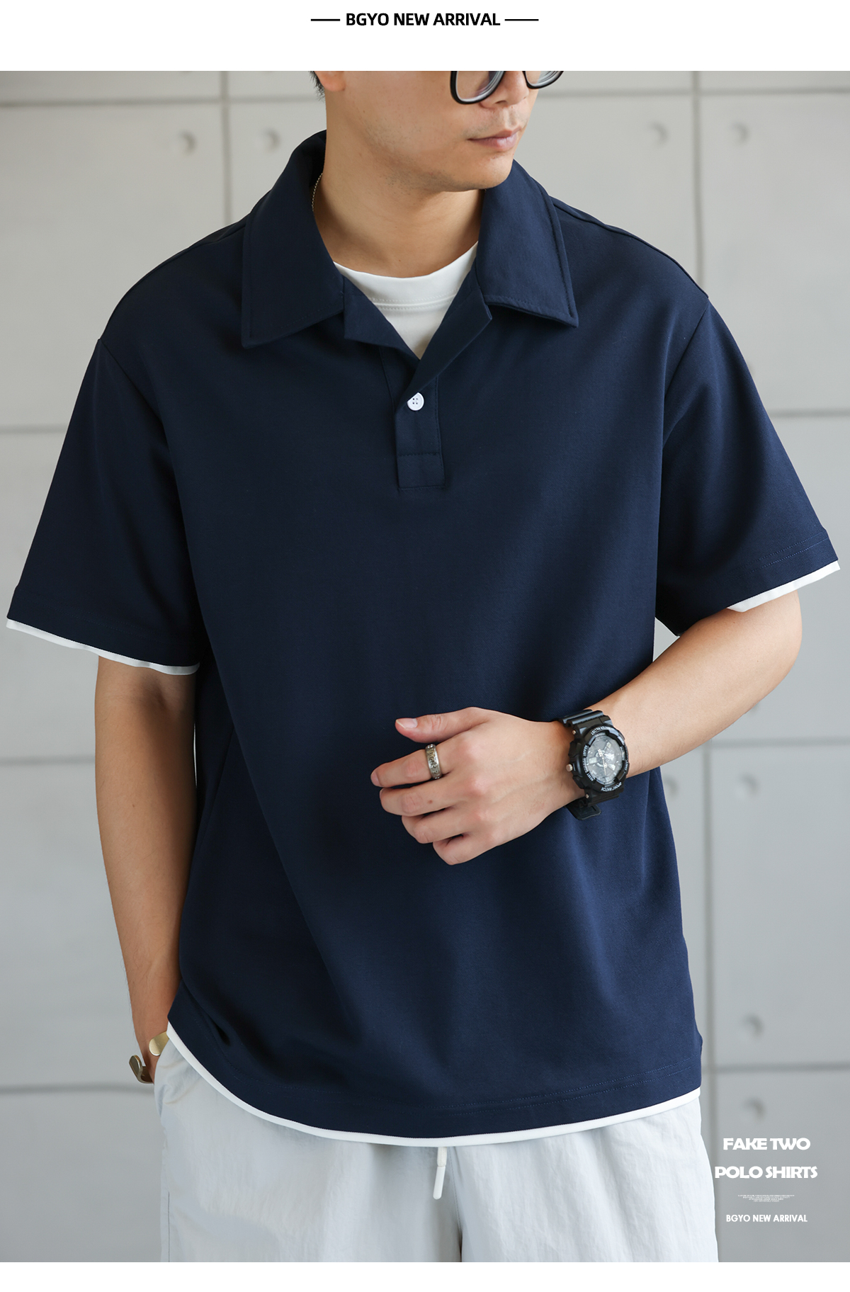 美式珠地假兩件古巴領POLO衫男通勤休閒薄款翻領短袖T恤