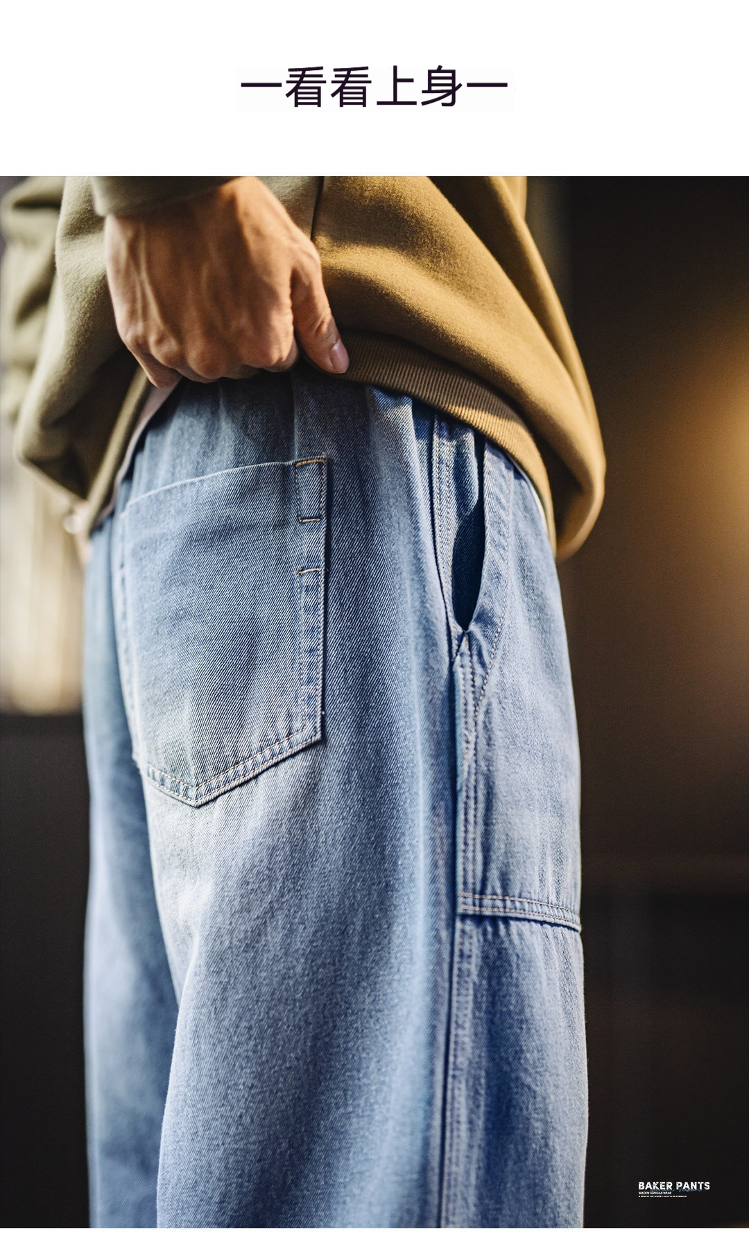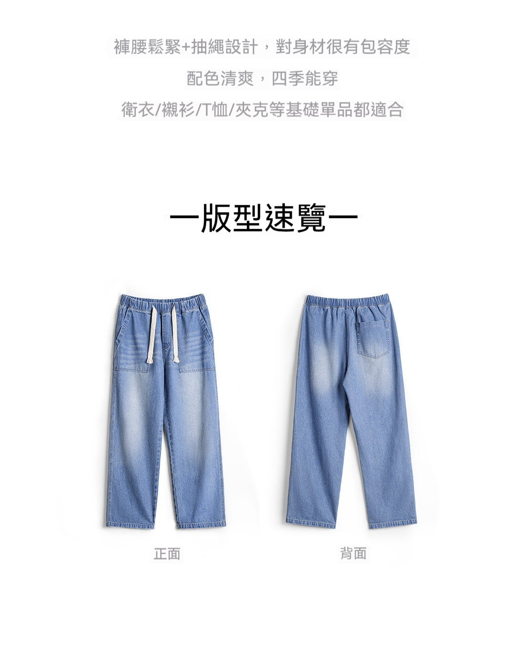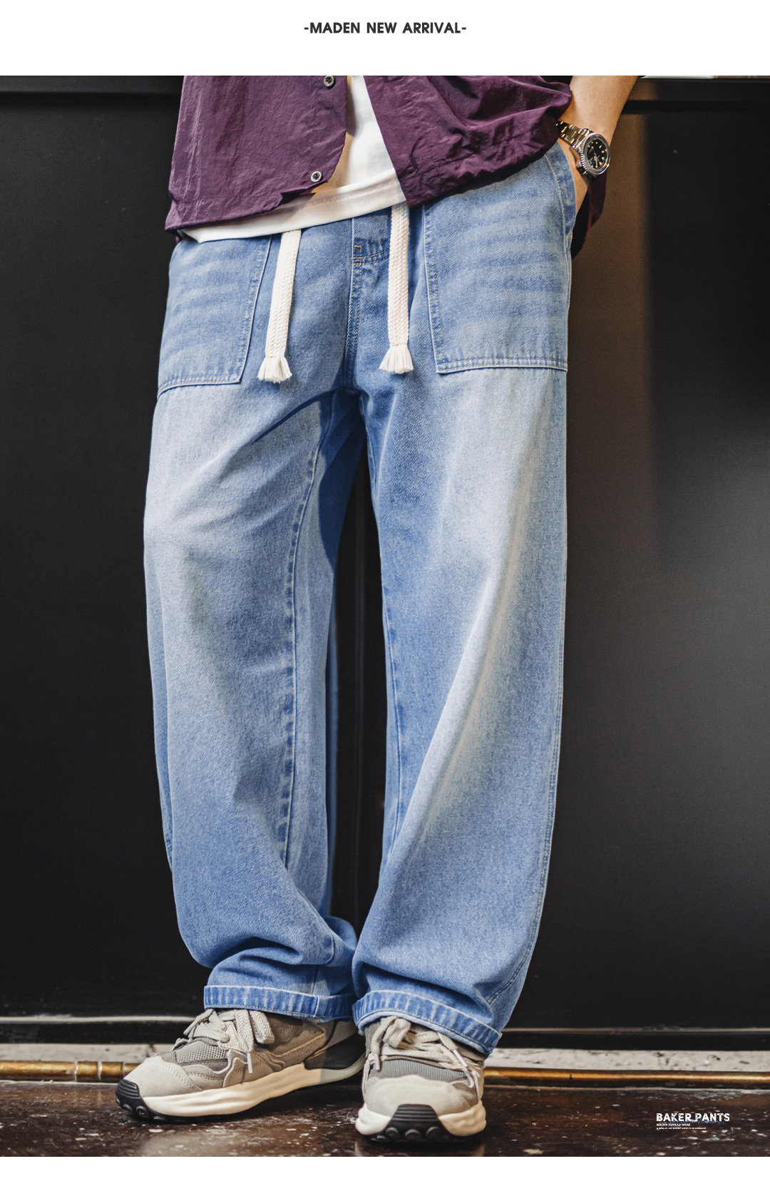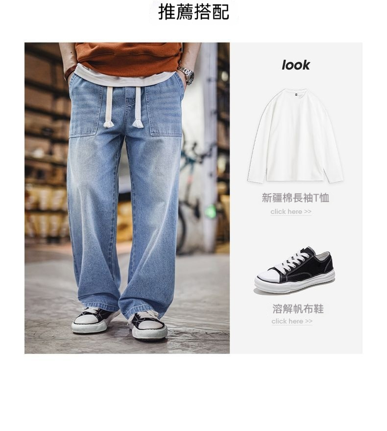 美式貝克水洗牛仔褲丹寧闊腿抽繩直筒休閒長褲子薄款男春