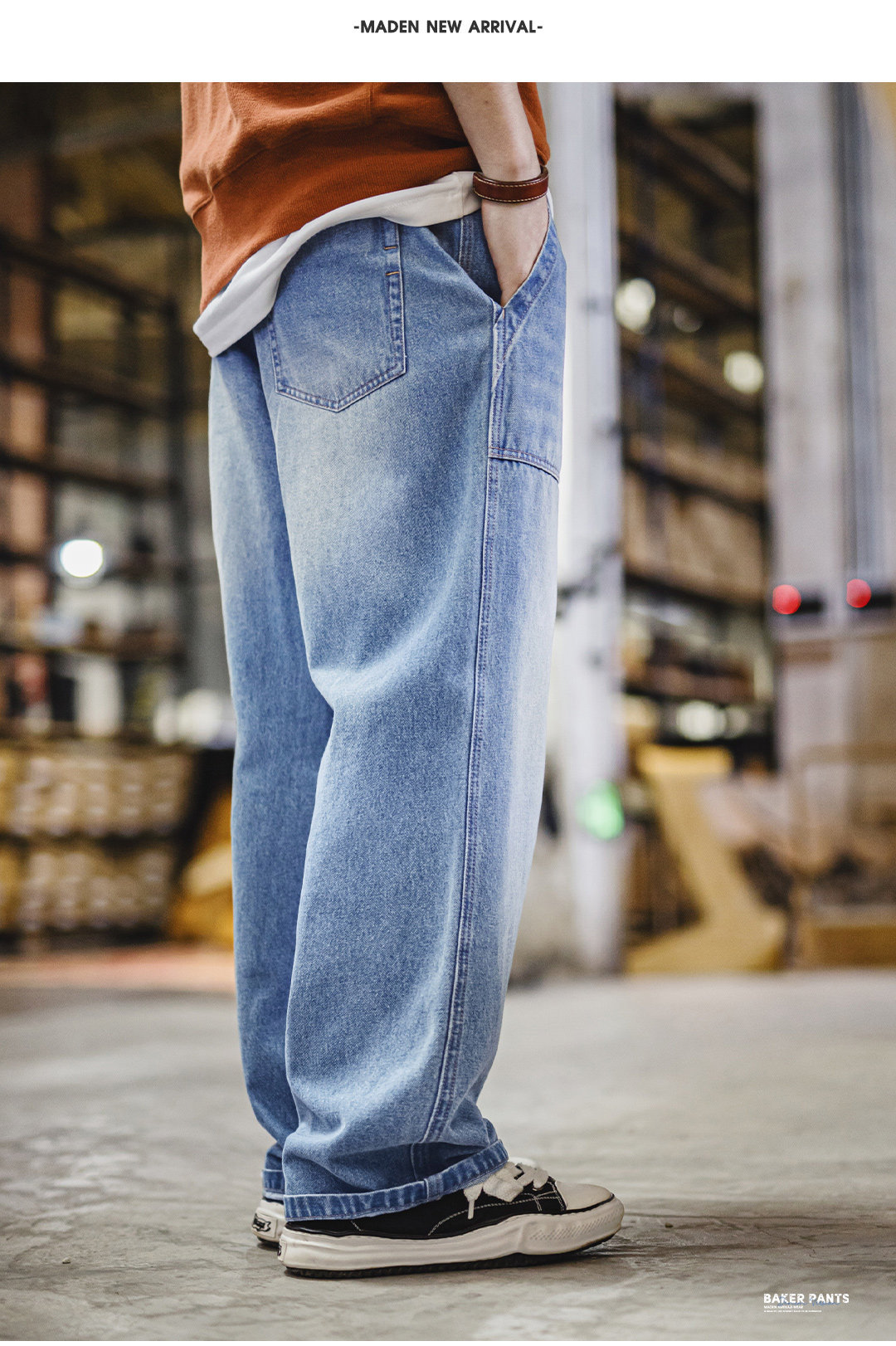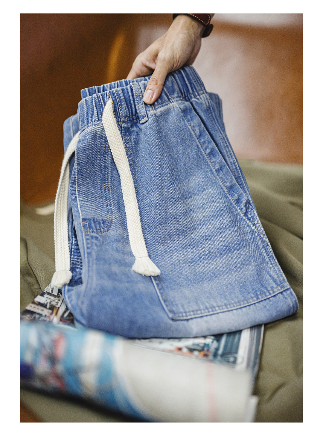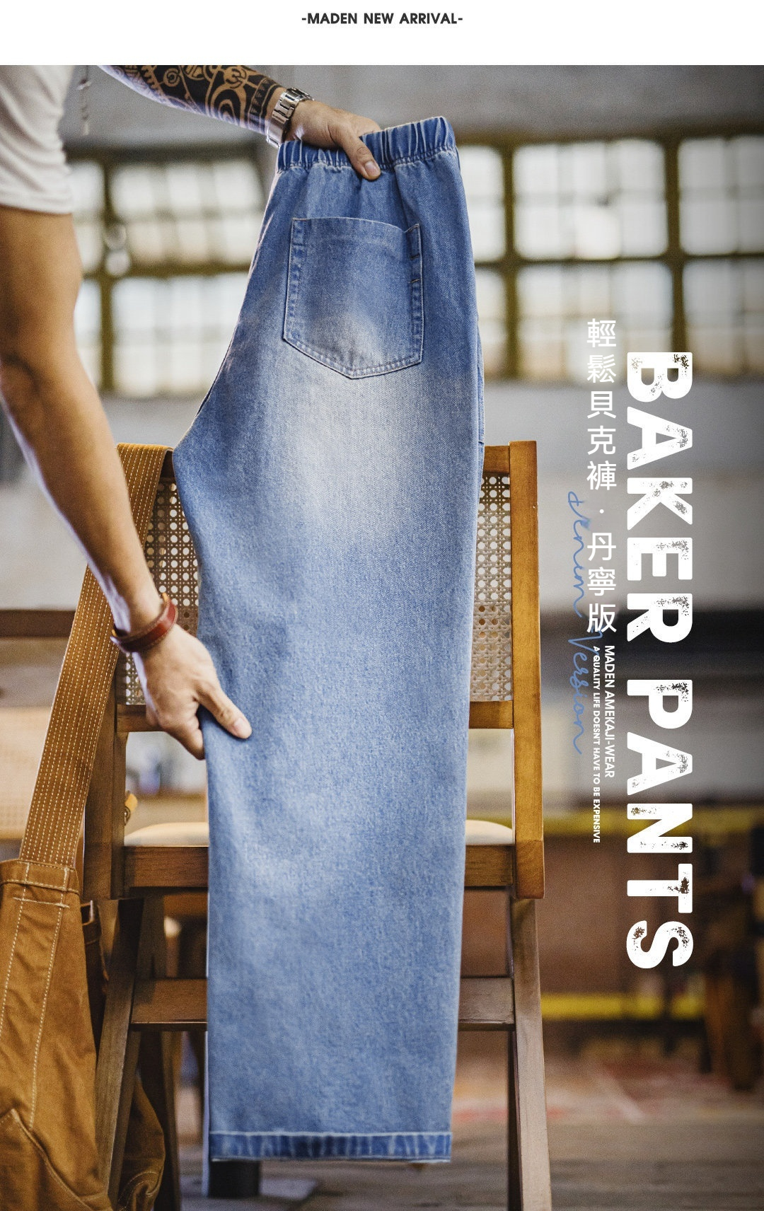 美式貝克水洗牛仔褲丹寧闊腿抽繩直筒休閒長褲子薄款男春