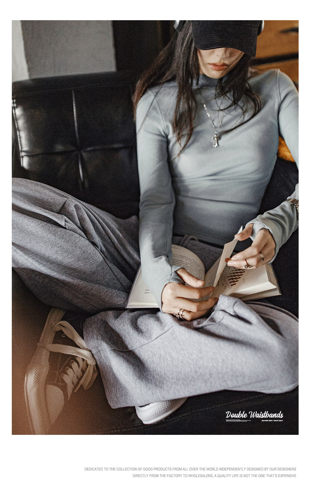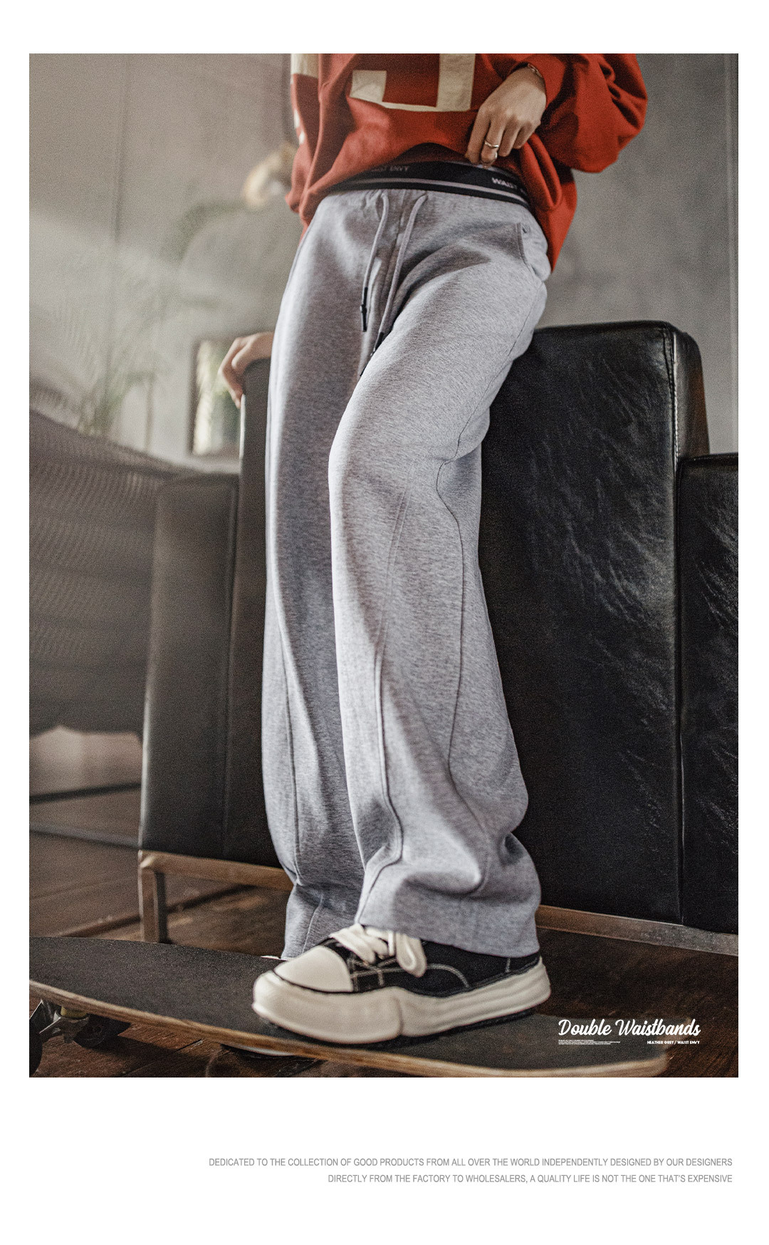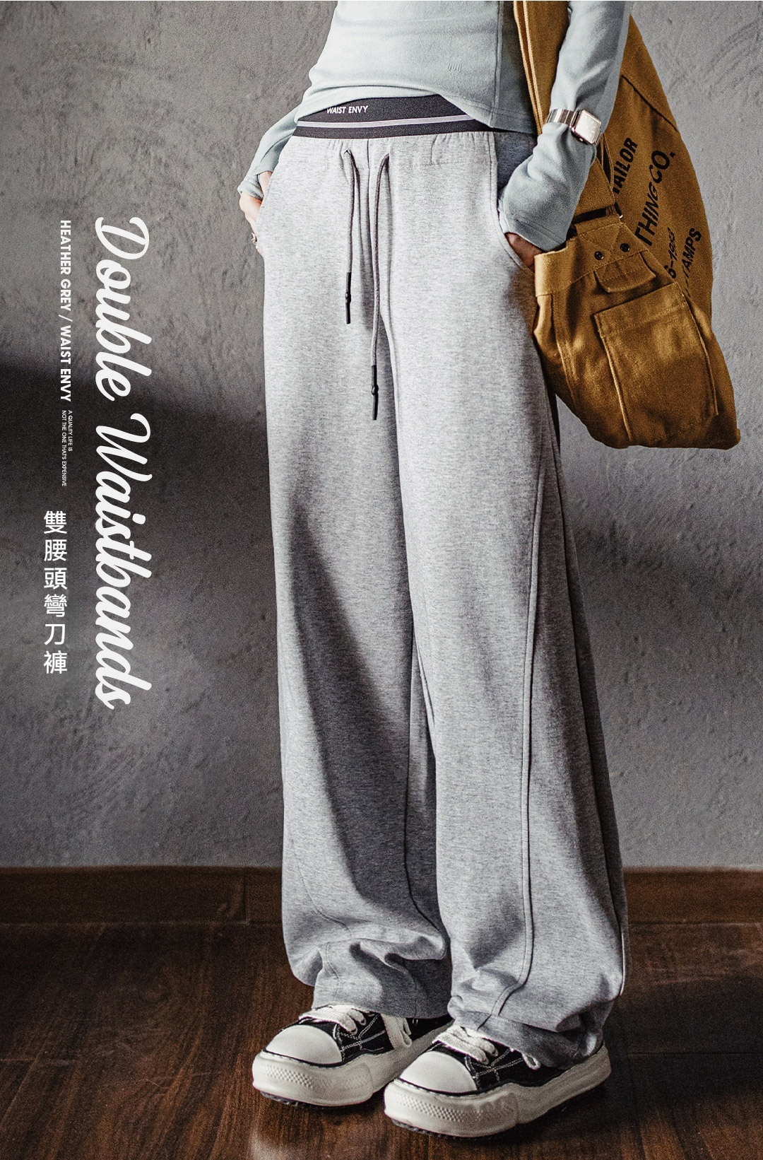 花灰撞色雙腰頭假兩件抽繩直筒香蕉鐮彎刀休閒運動衛褲女士秋
