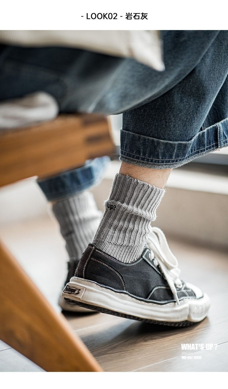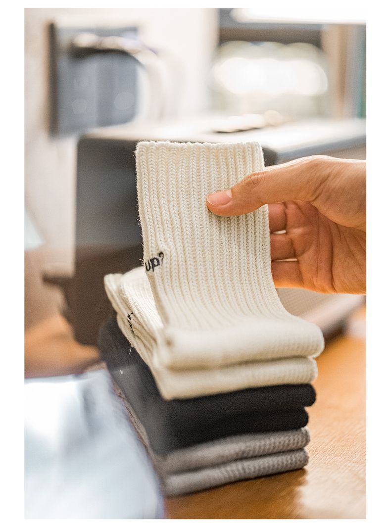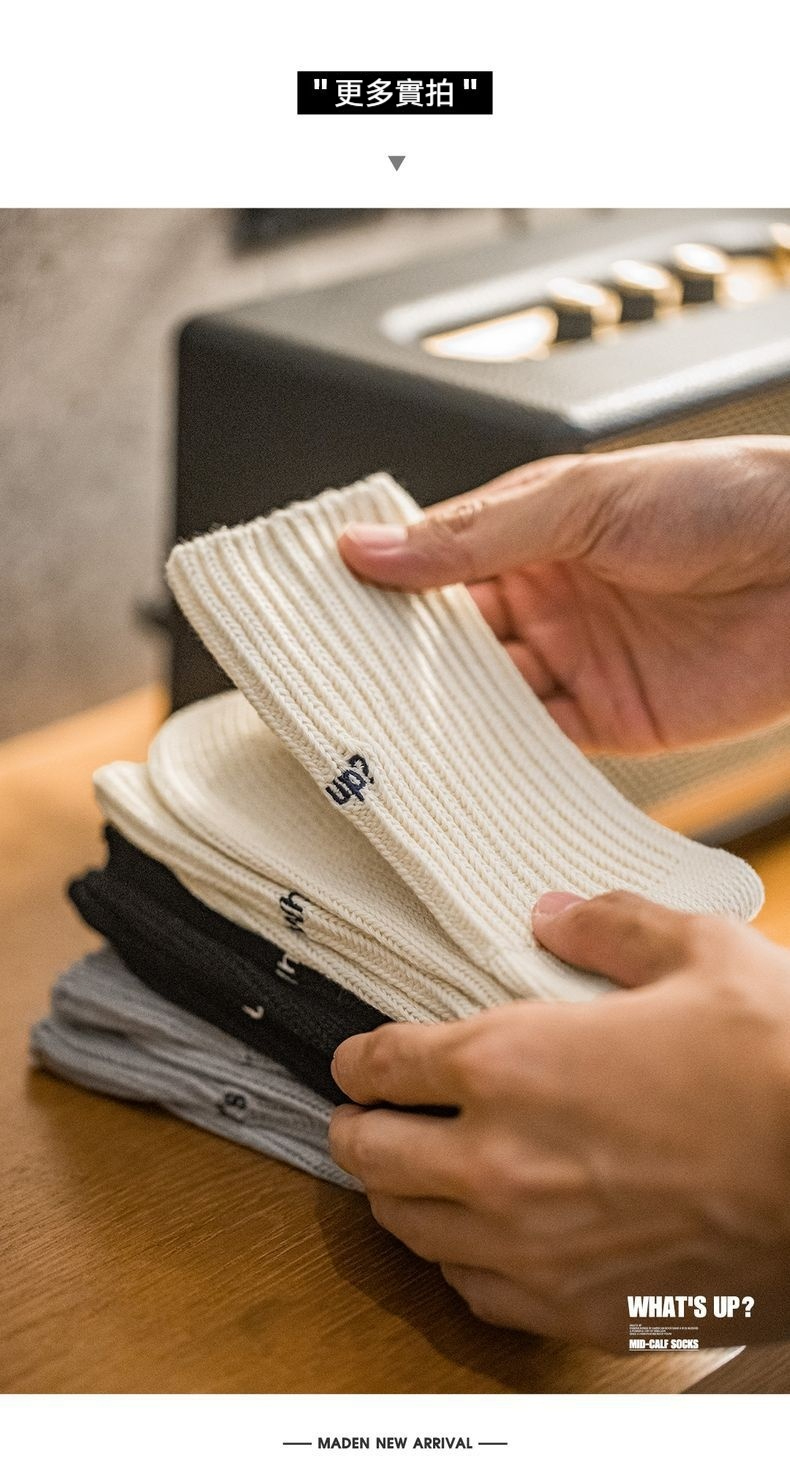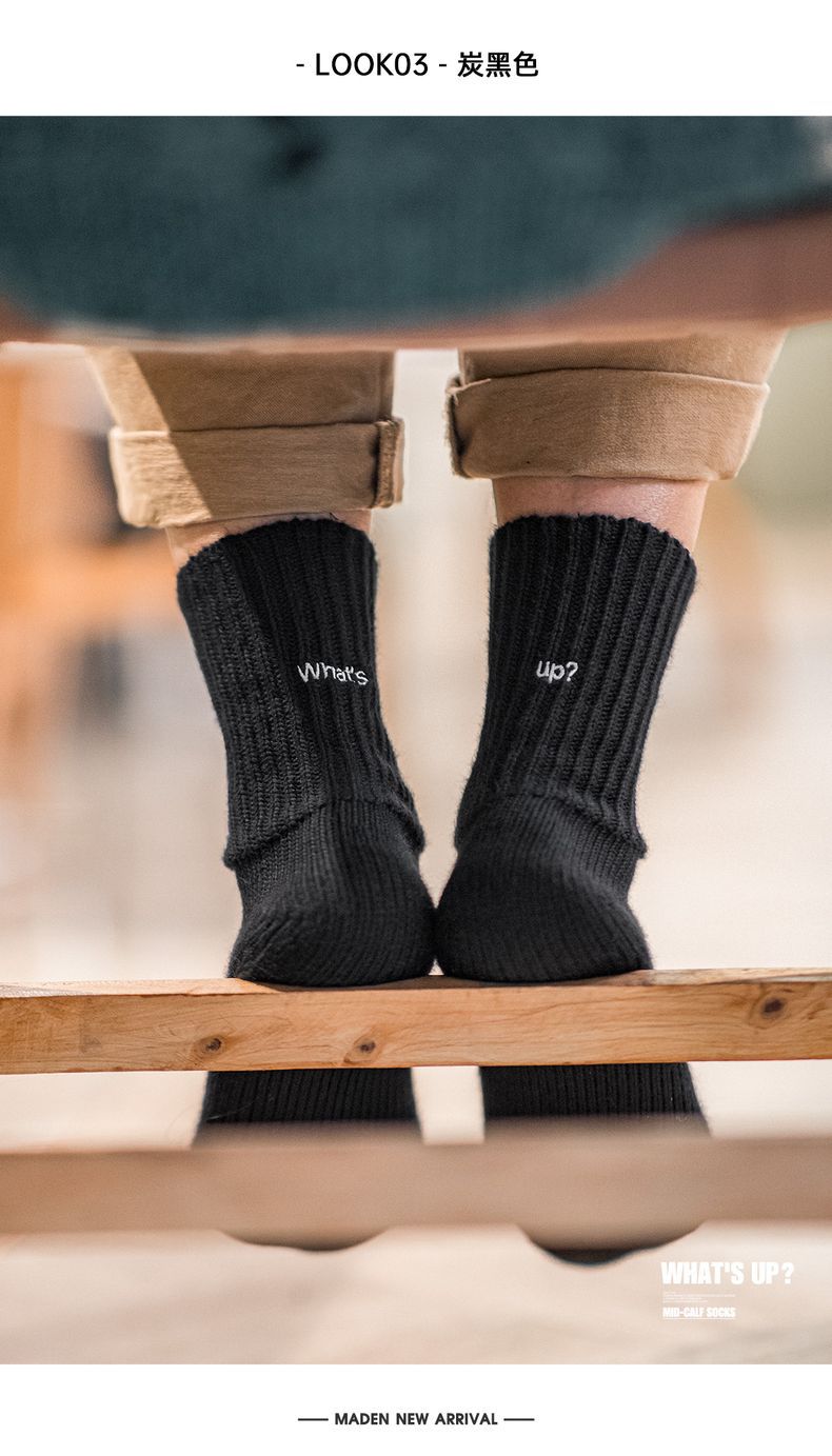 復古粗線刺繡針織中筒襪黑色運動透氣精梳棉長襪子男女秋