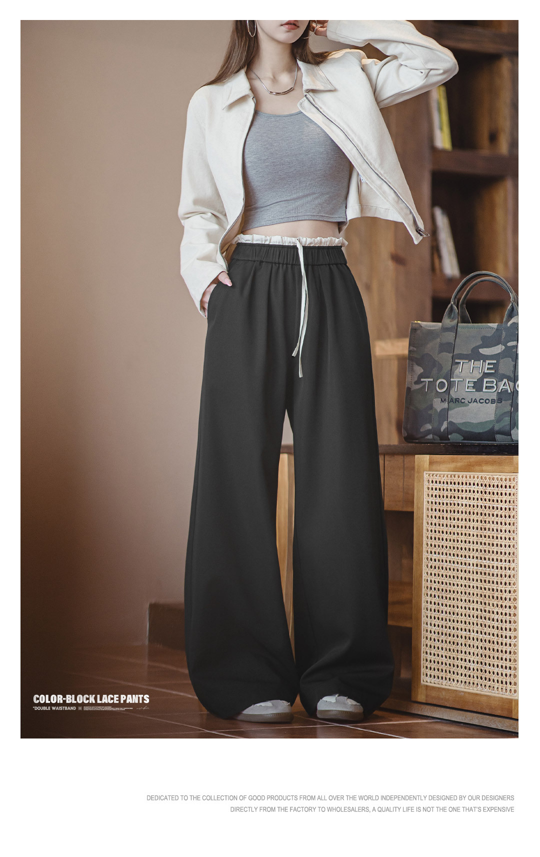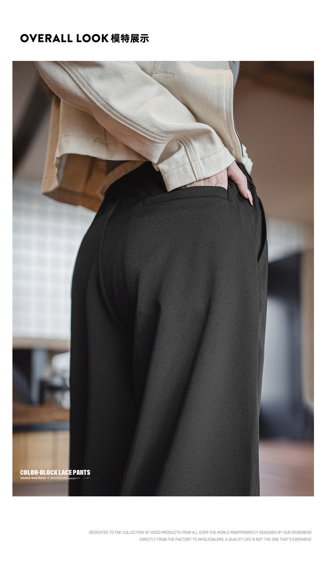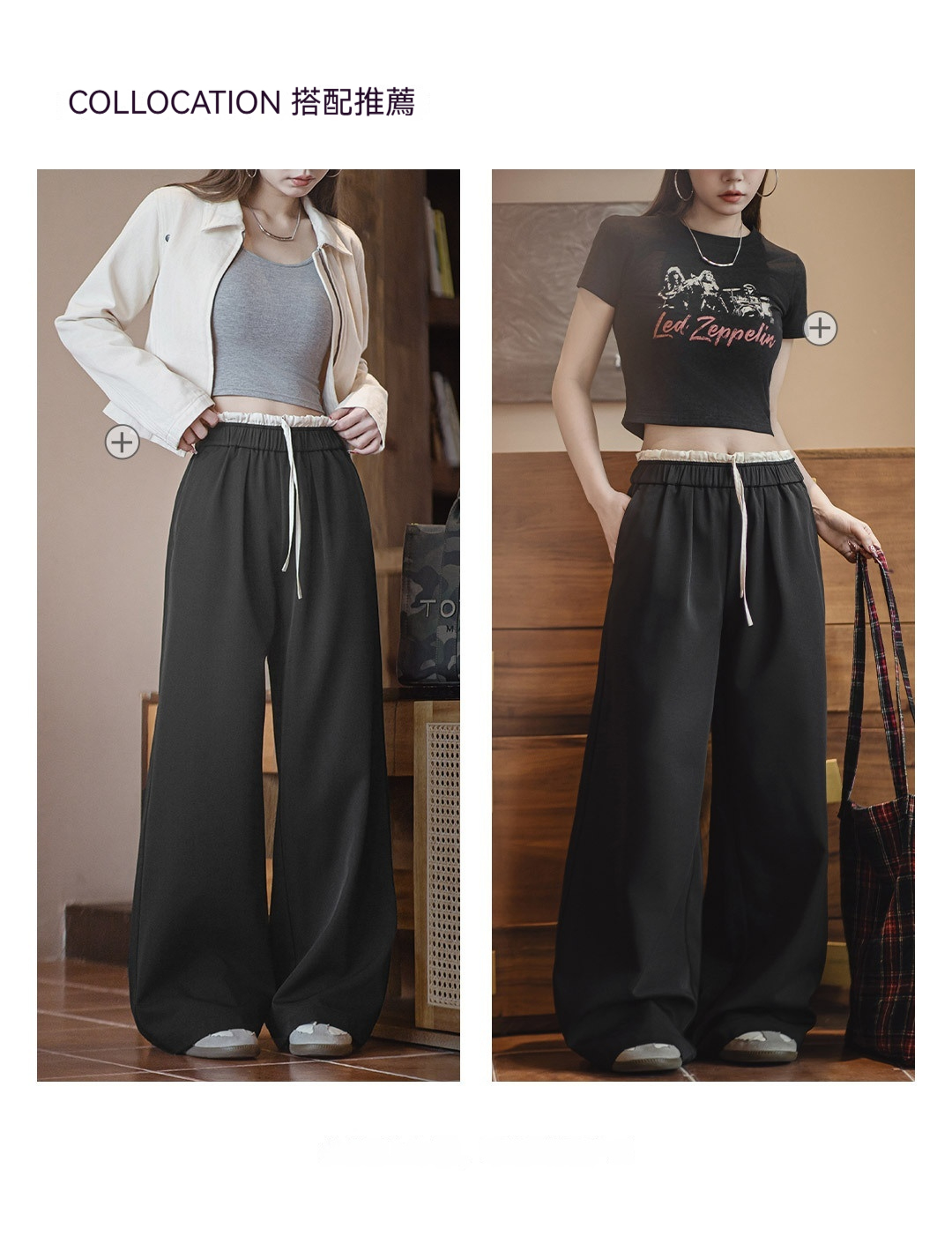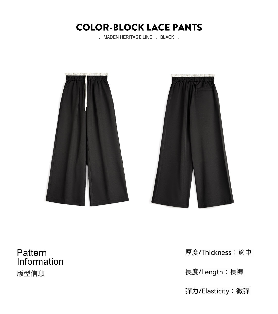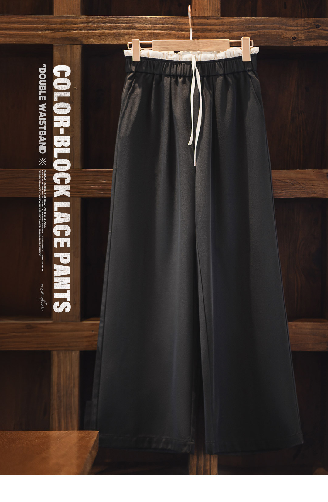 黑色寬鬆緊腰頭拼接休閒褲花邊直筒闊腿垂感西褲小個子女士夏