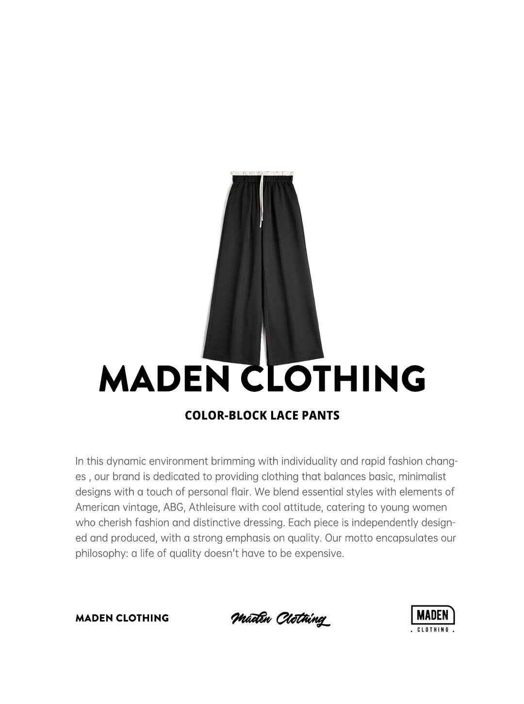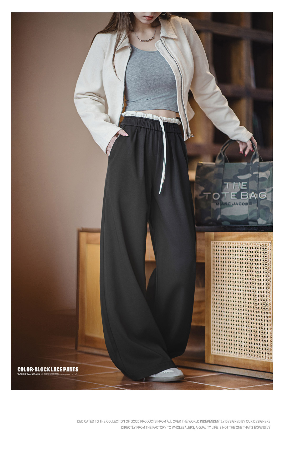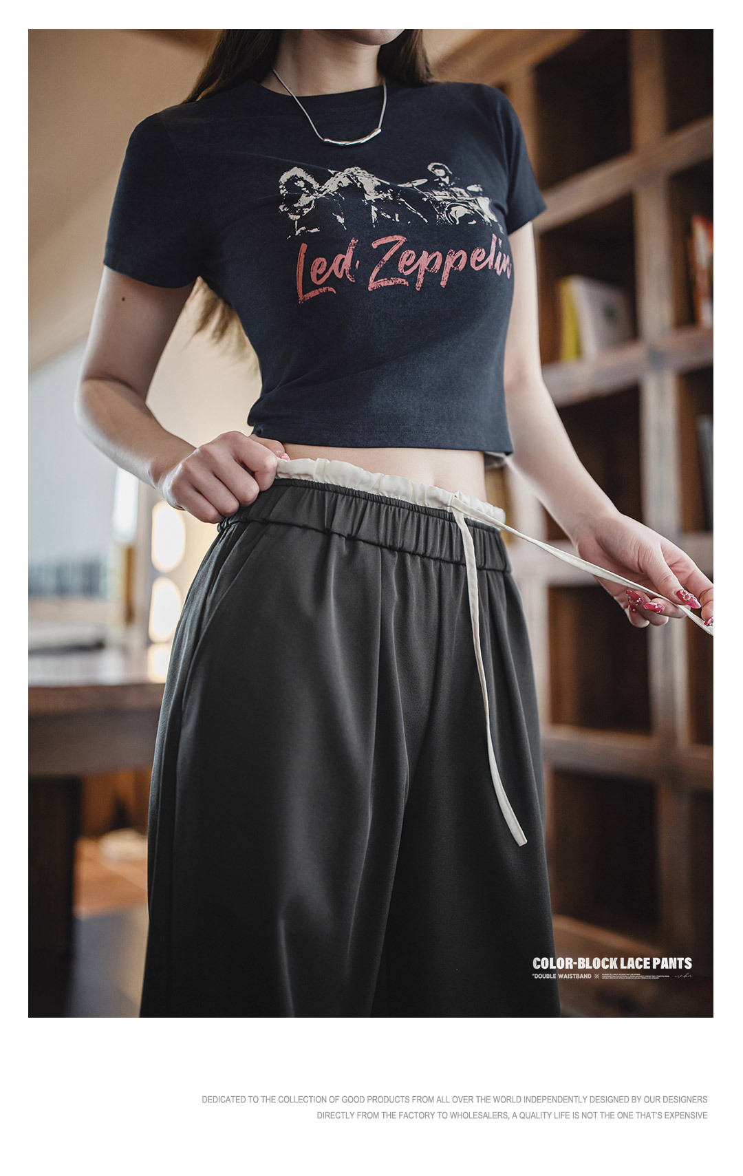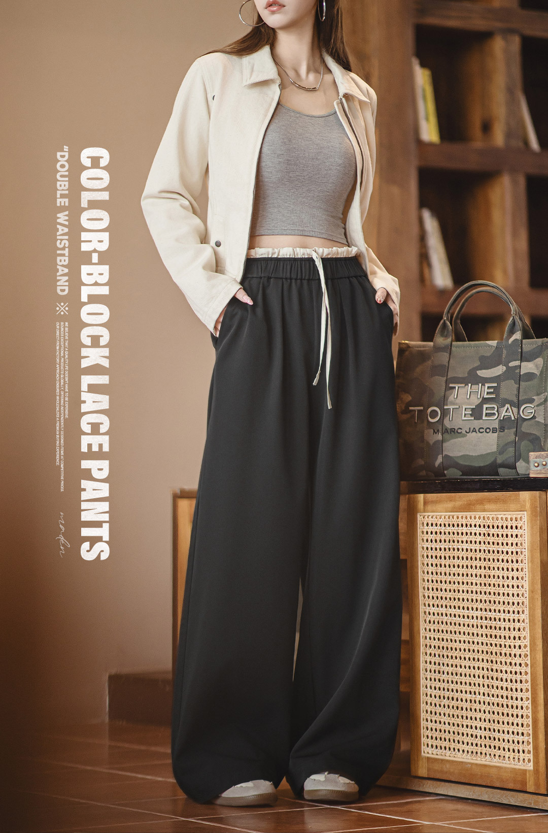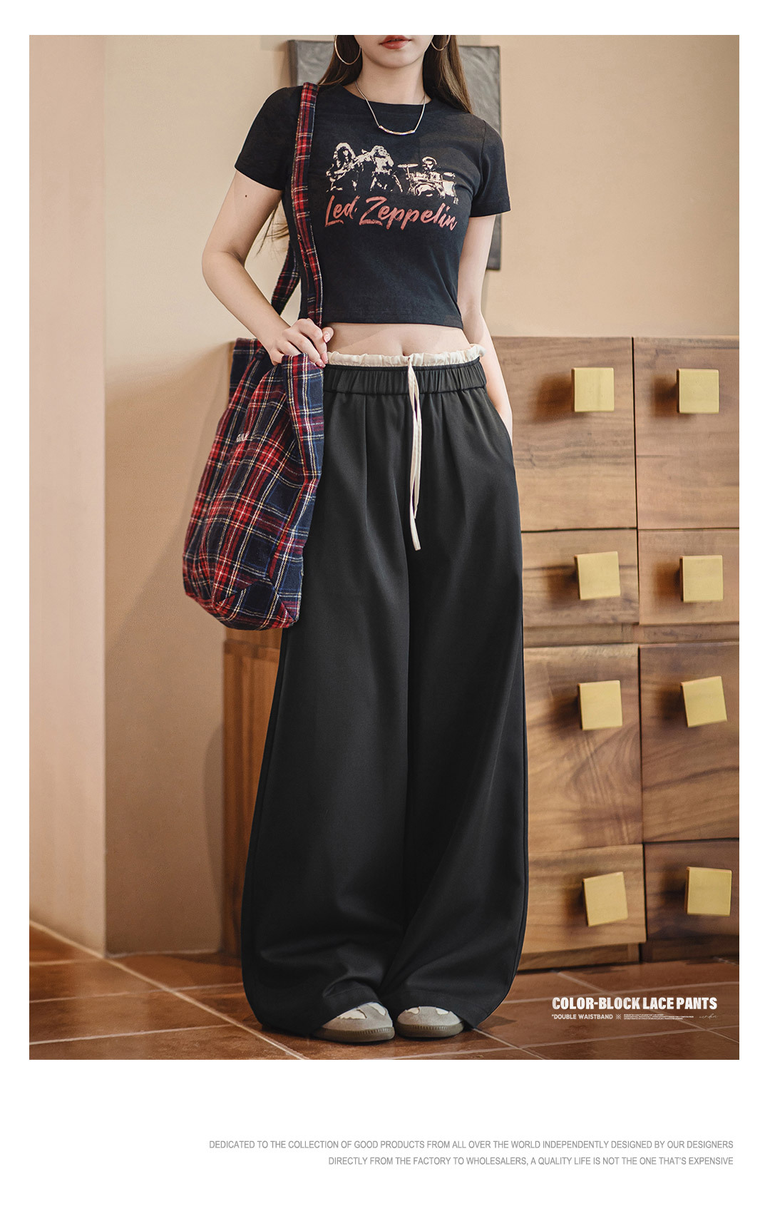 黑色寬鬆緊腰頭拼接休閒褲花邊直筒闊腿垂感西褲小個子女士夏