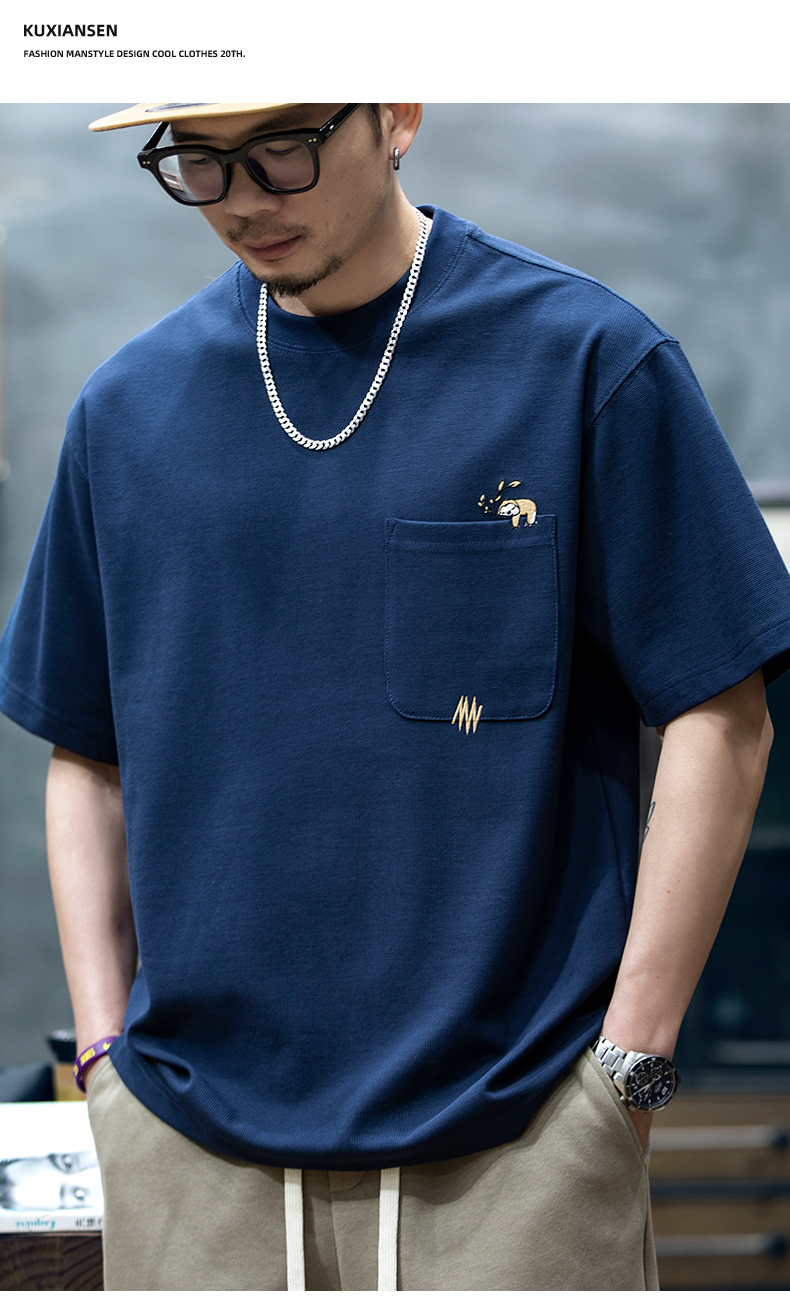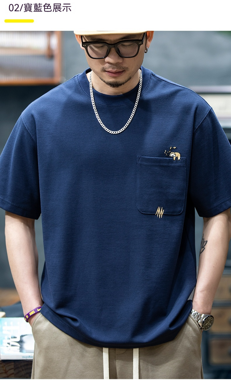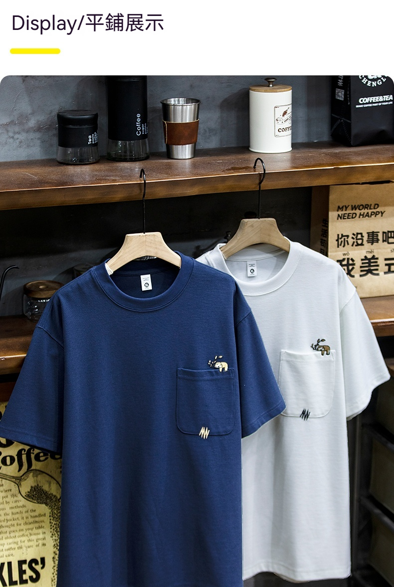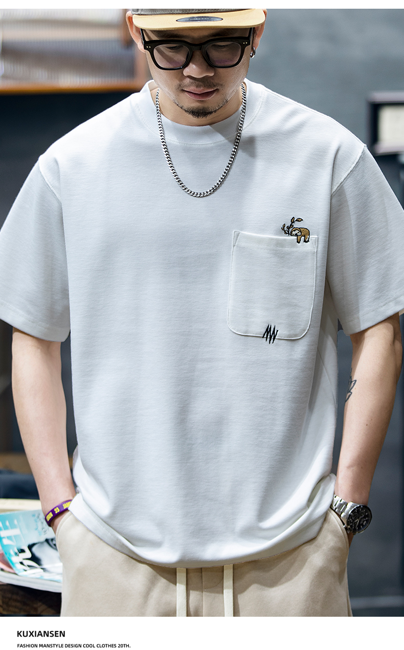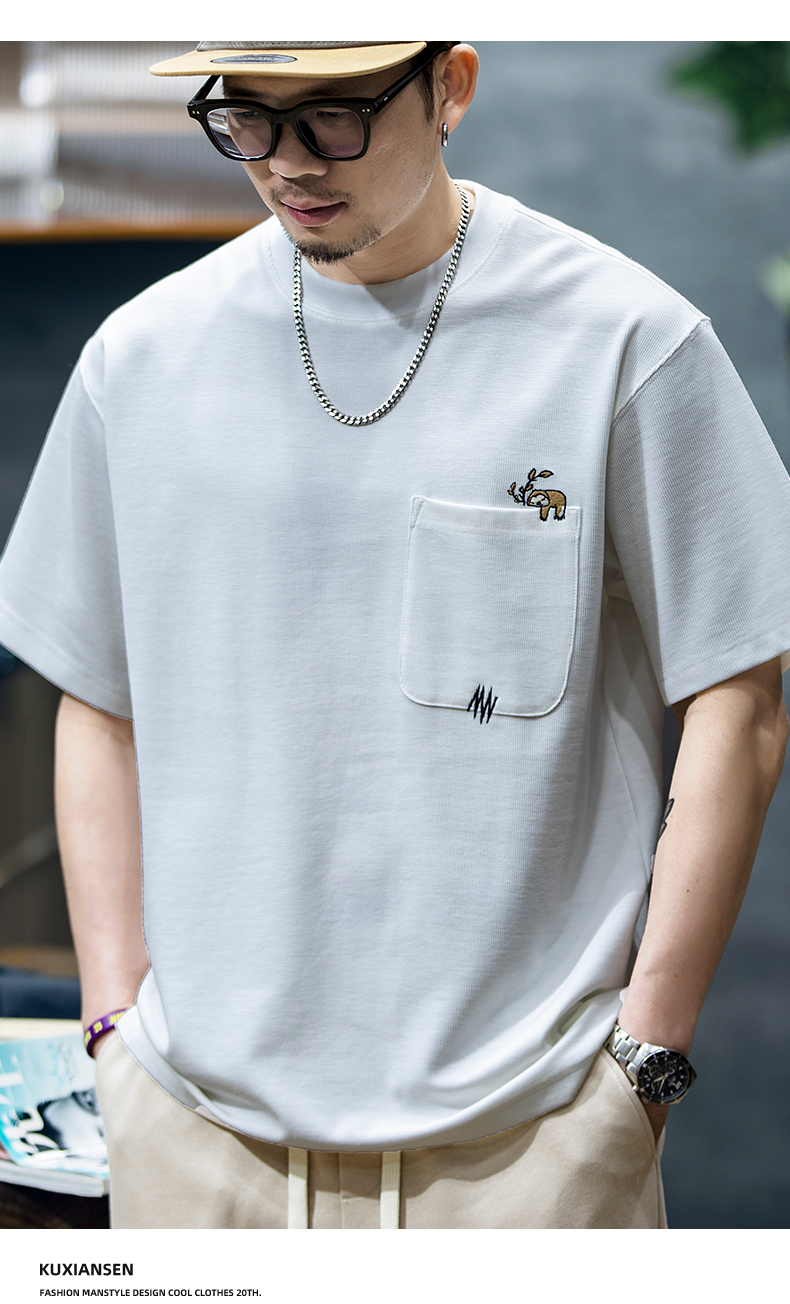 260g米格短袖t恤男夏季新款潮牌小樹懶刺繡口袋寬鬆休閒半袖T恤