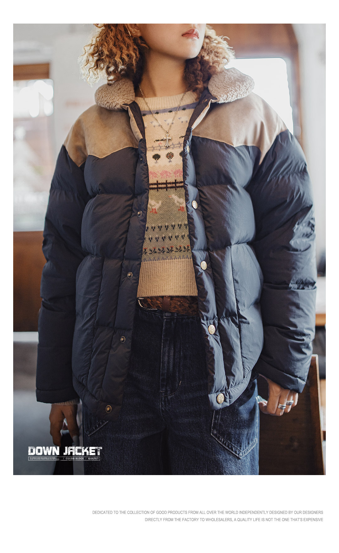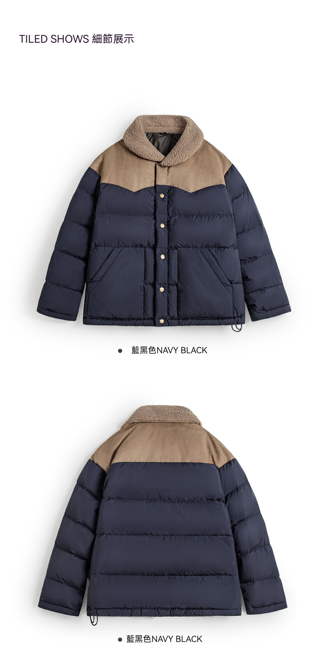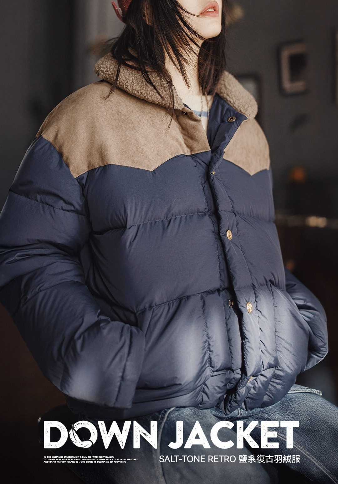 90白鴨絨撞色麂皮拼接翻領加厚保暖工裝羽絨服夾克外套女冬季