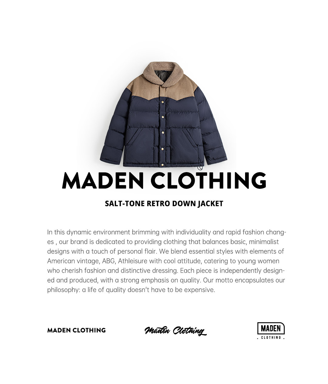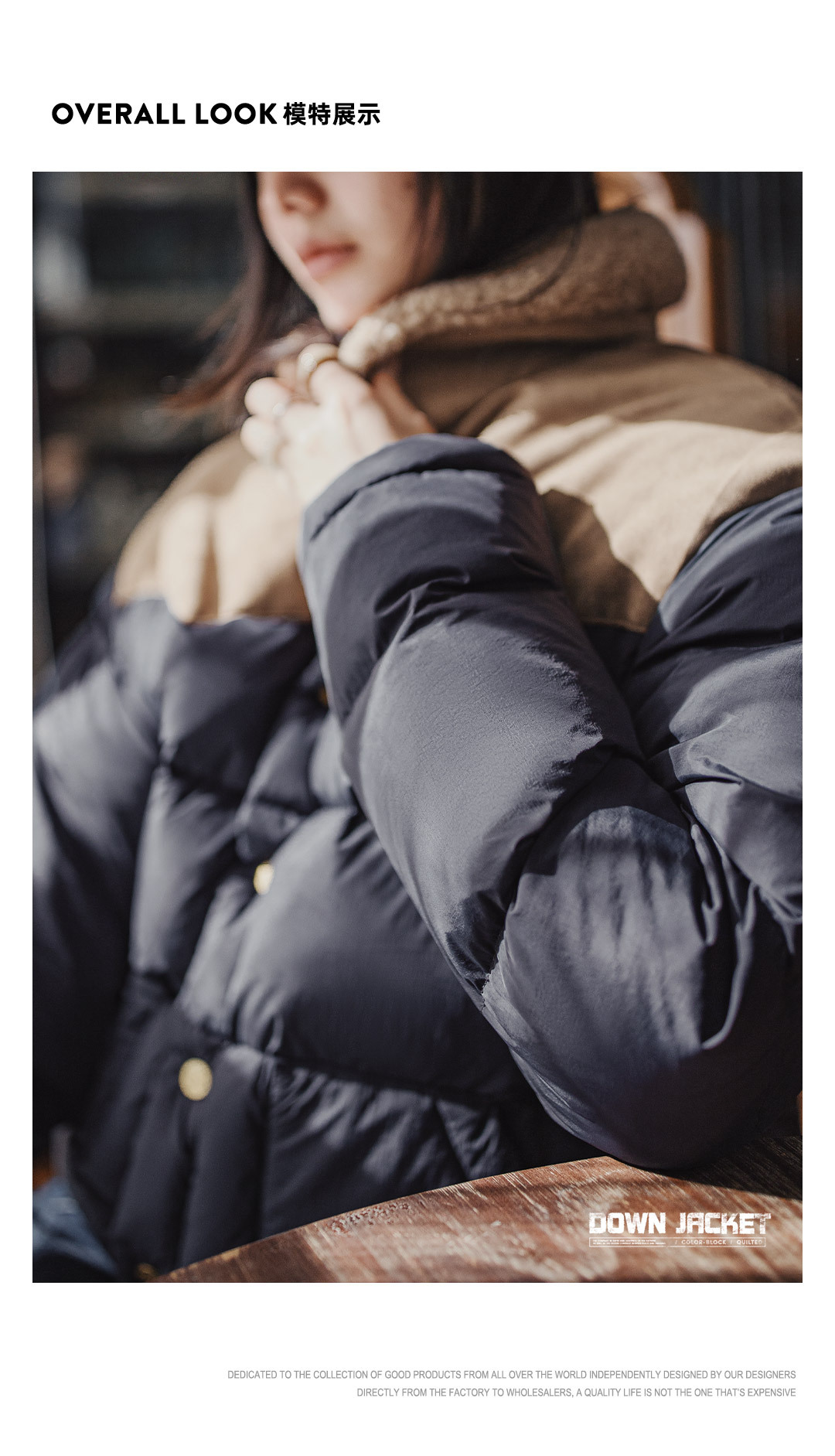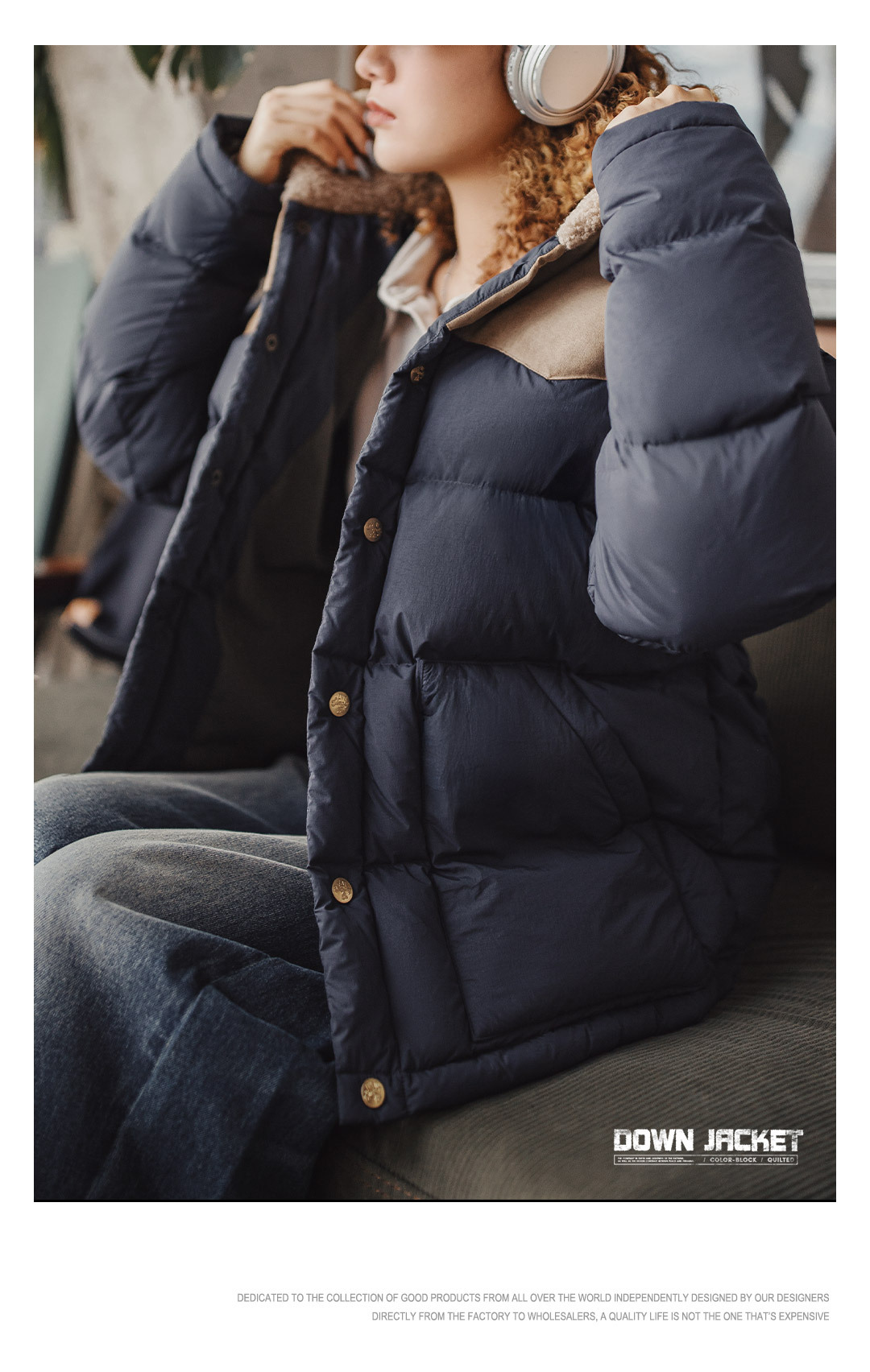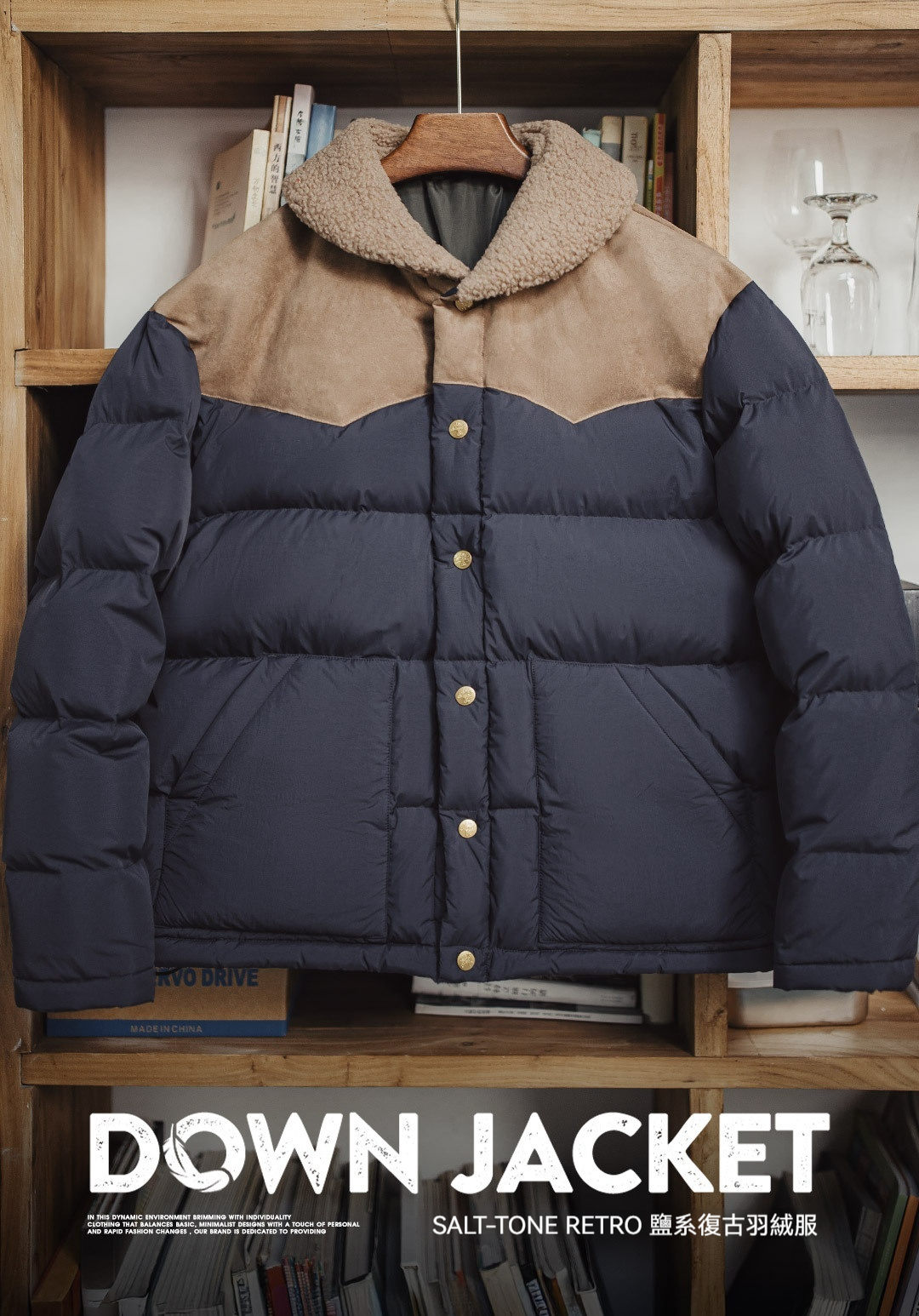 90白鴨絨撞色麂皮拼接翻領加厚保暖工裝羽絨服夾克外套女冬季