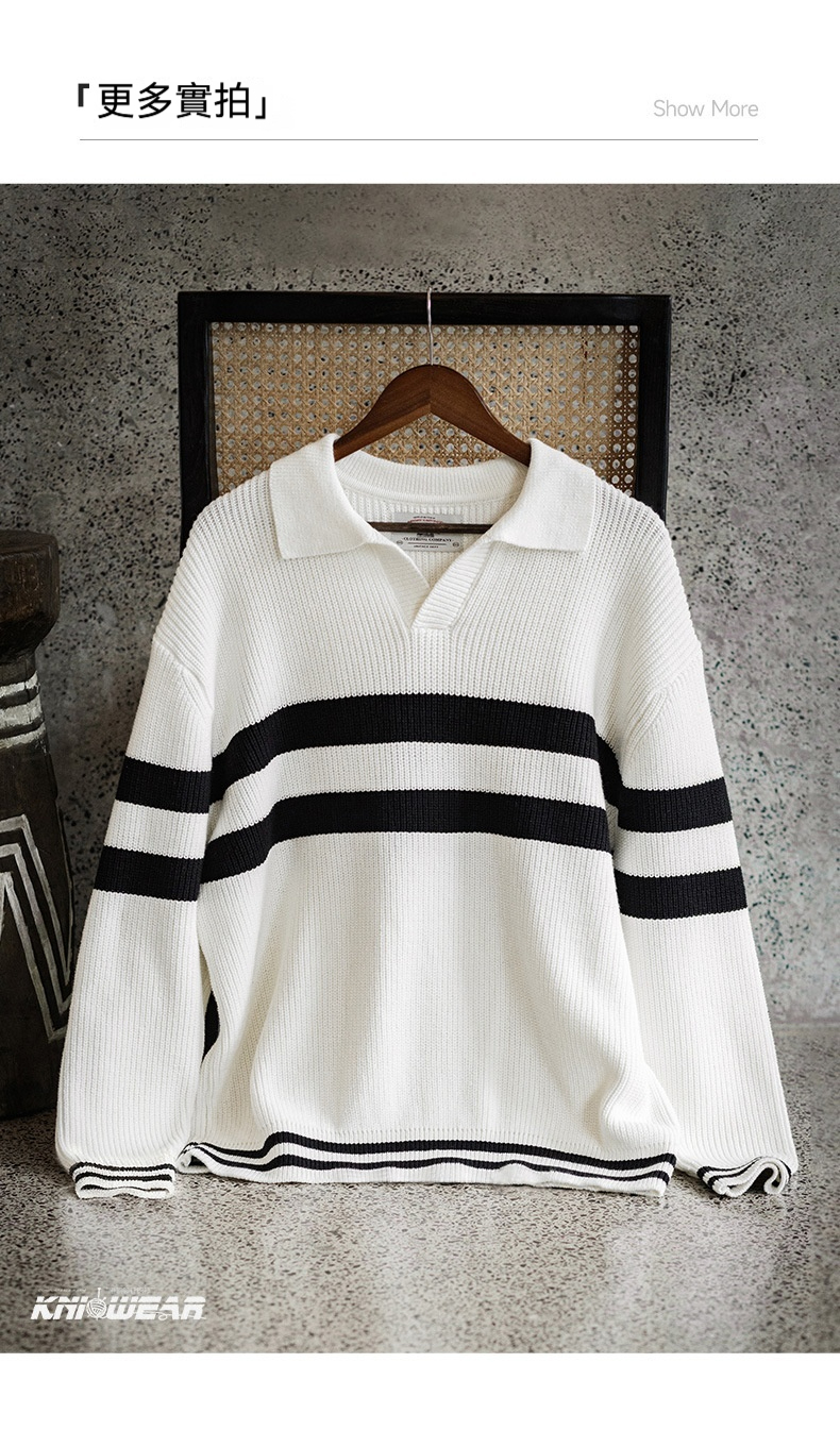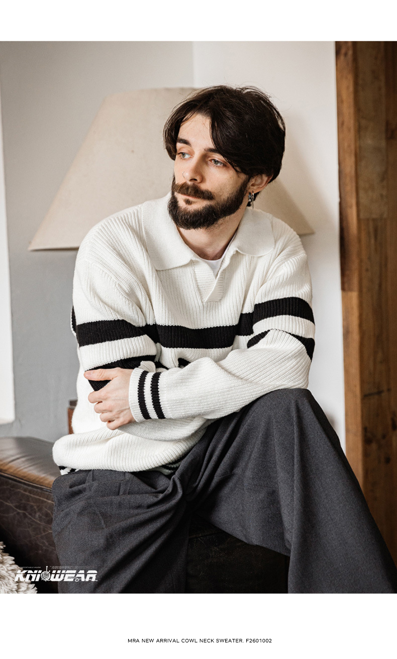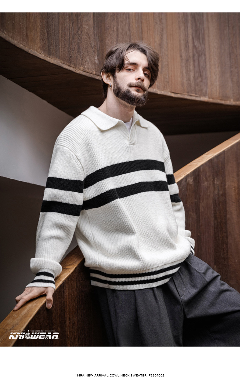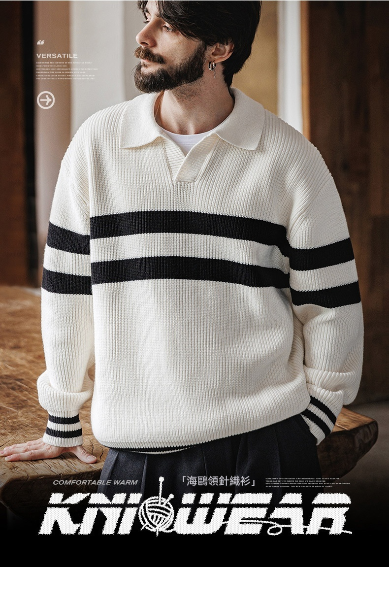 MRA海鷗領polo毛衣條紋套頭V領內搭加絨加厚翻領針織衫潮男冬