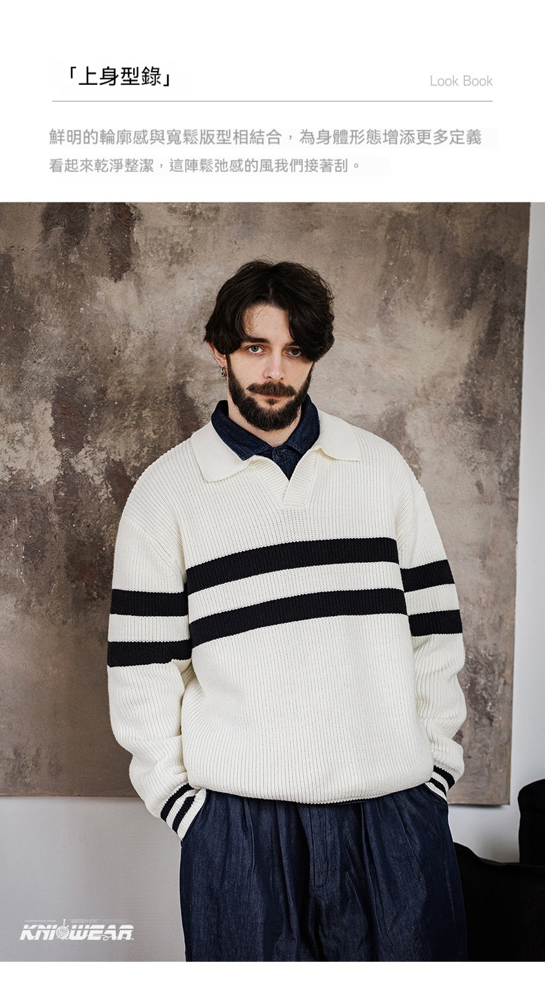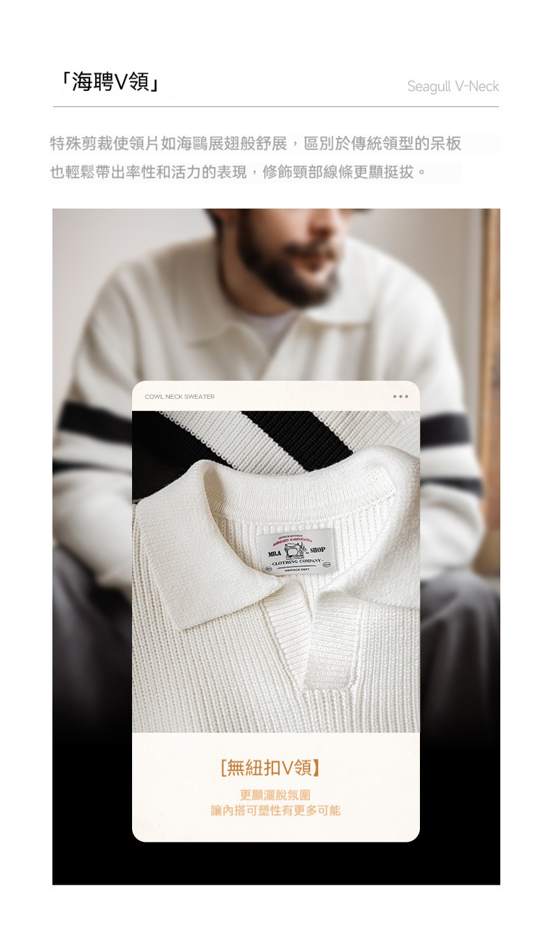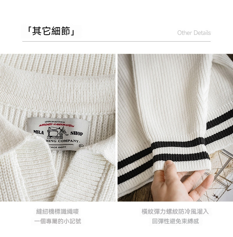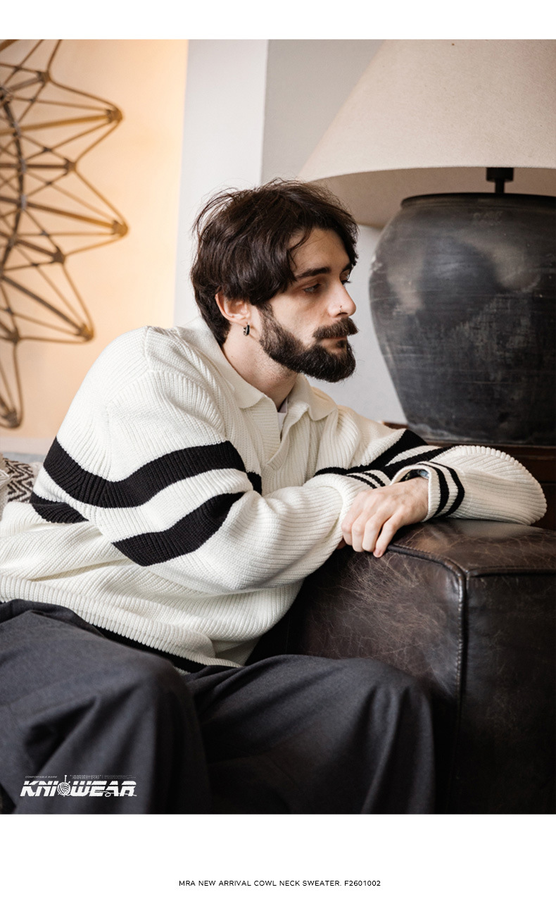 MRA海鷗領polo毛衣條紋套頭V領內搭加絨加厚翻領針織衫潮男冬